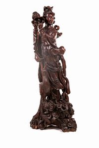 cm 75x28x43 raffigurante un monaco inginocchiato su un doppio fiore di loto, la mano destra posata sul palmo della [..]