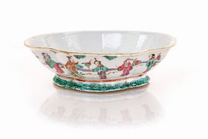 cm 8x27x23 decorata con figure policrome in corteo; orlo sagomato dorato. Lievi difetti
