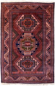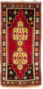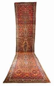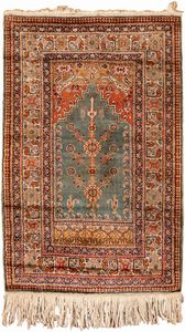 cm 90x62 campo rosso con mihrab centrata da lampada pensile; racchiuso da molteplici piccole bordure a motivi [..]