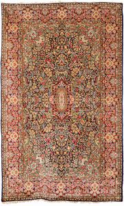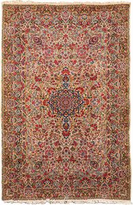 cm 193x93 con due medaglioni chiari con fiori rossi e gialli; cantonali blu con corolle bianche, rosse e arancio; [..]