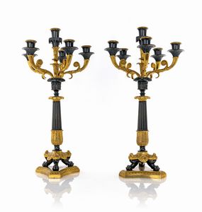 Coppia di candelabri in bronzo dorato e brunito d'epoca Impero a quattro luci