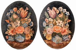 Coppia di medaglioni ovali in scagliola raffiguranti composizioni floreali