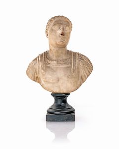 cm 40x28x11 raffigurante un Imperatore romano; piedistallo a rocchetto su base quadrangolare in marmo nero. Piccola [..]