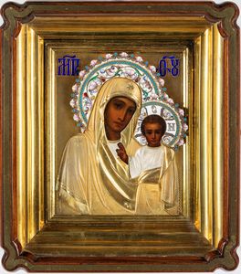 tempera su tavola, cm 25x22 raffigurante Madonna col Bambino caratterizzati da auree in smalti policromi; entro [..]