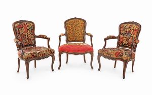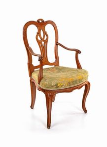 cm 105x63x49 schienale a giorno centrato da cartiglio asimmetrico sormontato da un rilievo vegetale intagliato, [..]