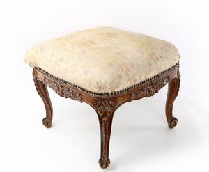 cm 42x48x48 con seduta quadrangolare imbottita e fascia centrata da rilievi vegetali minuziosamente intagliati; [..]