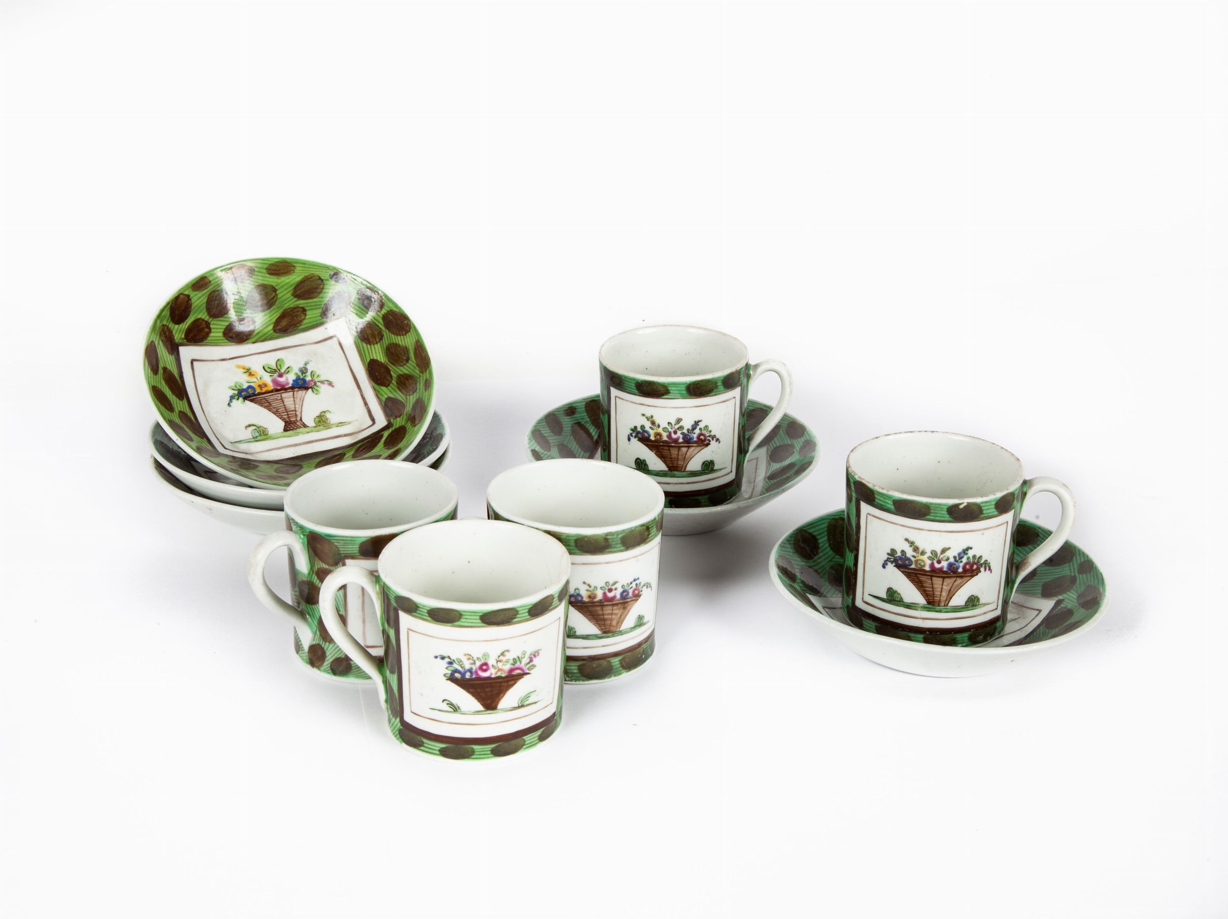 Cinque tazzine da caffè con piattino in porcellana policroma