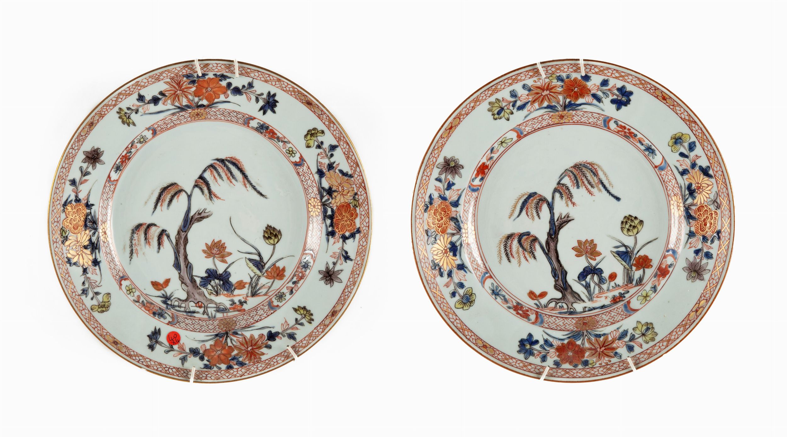 Coppia di antichi piatti in porcellana policroma, Cina, Dinastia Qing