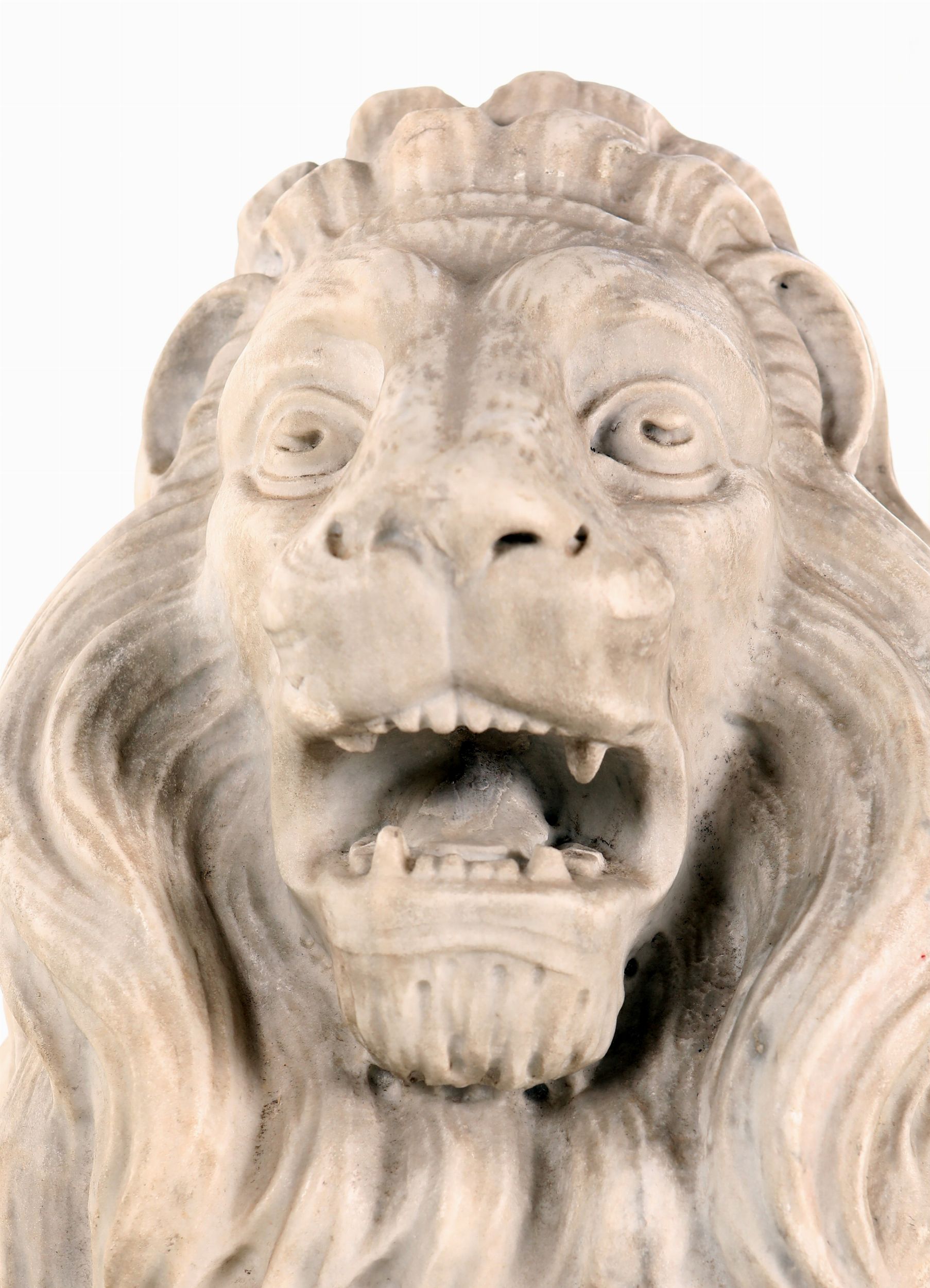 Coppia di leoni da ingresso in marmo bianco, fine del XIX secolo
