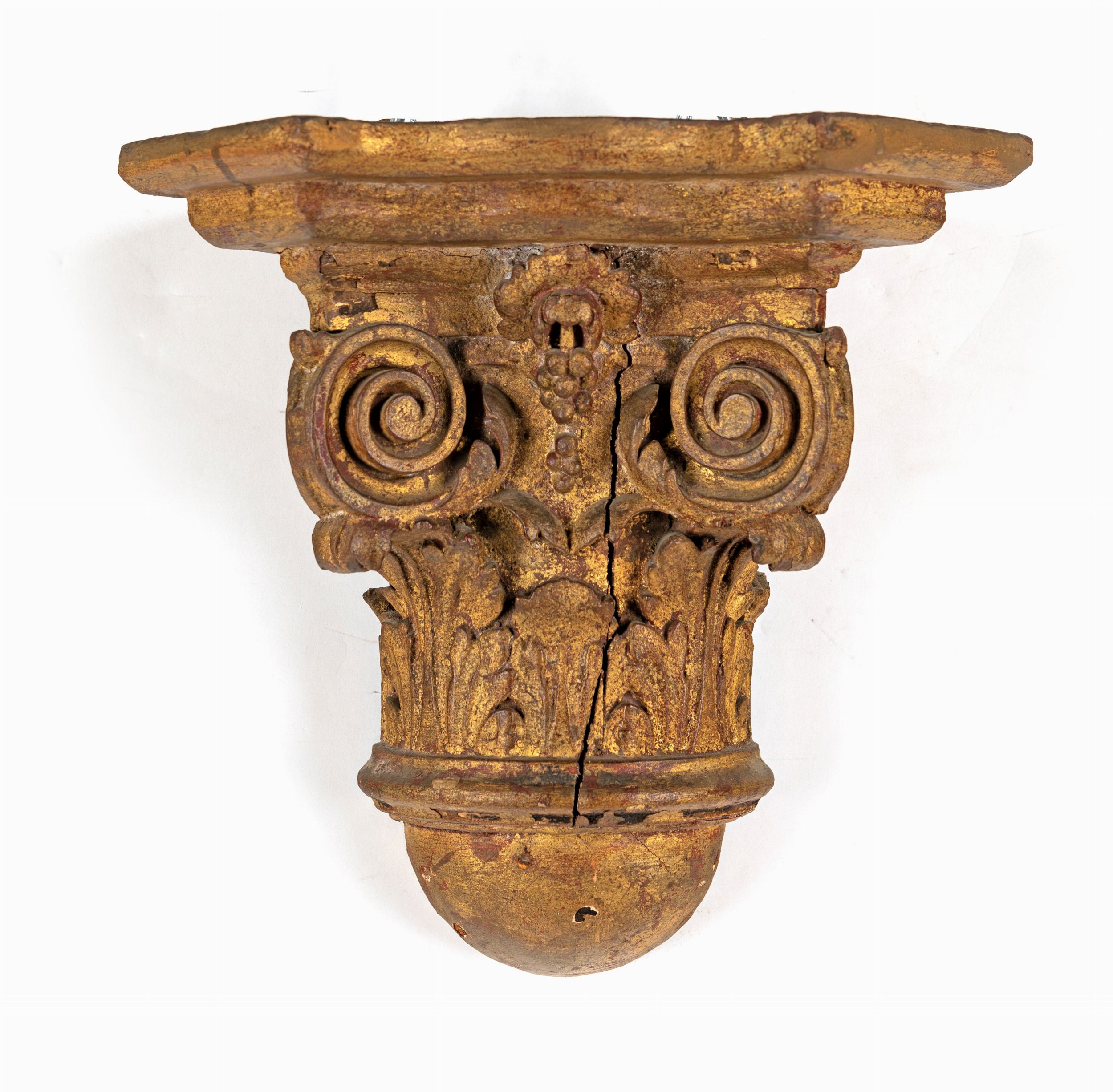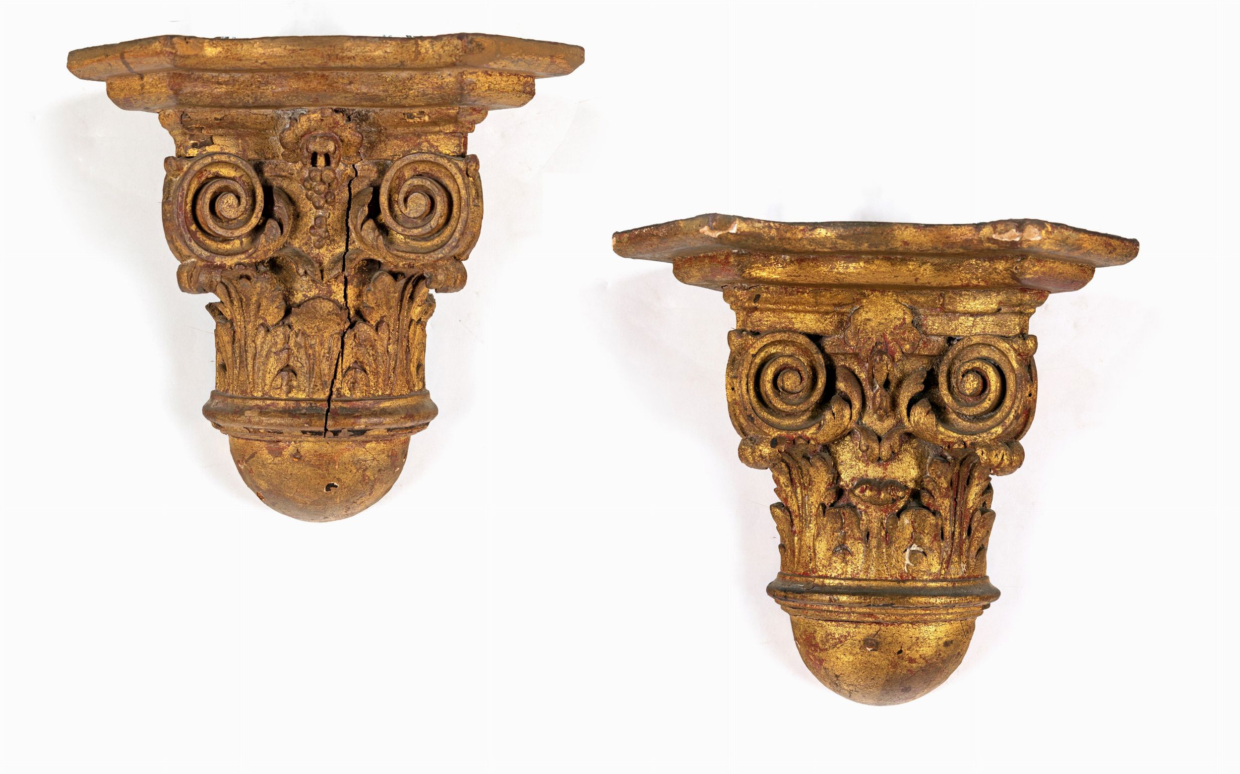 Coppia di mensole in legno intagliato e dorato a forma di capitello, XIX secolo