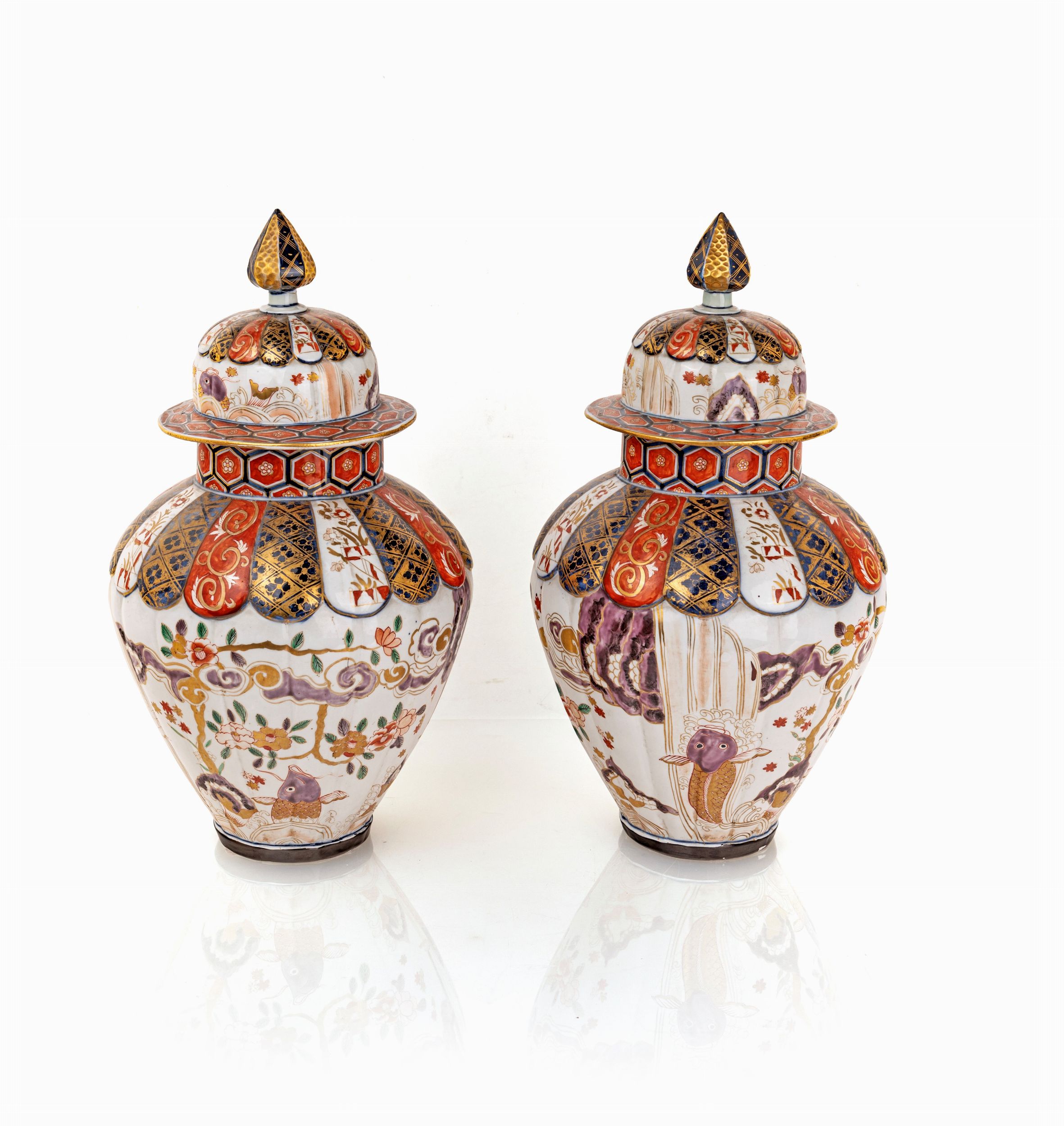 altezza cm 46 caratterizzate da carpe delineate in viola con lumeggiature dorate; la parte superiore ed il coperchio scanditi da riserve in rilievo a decorazione alternata nei toni caratteristici dell'Imari