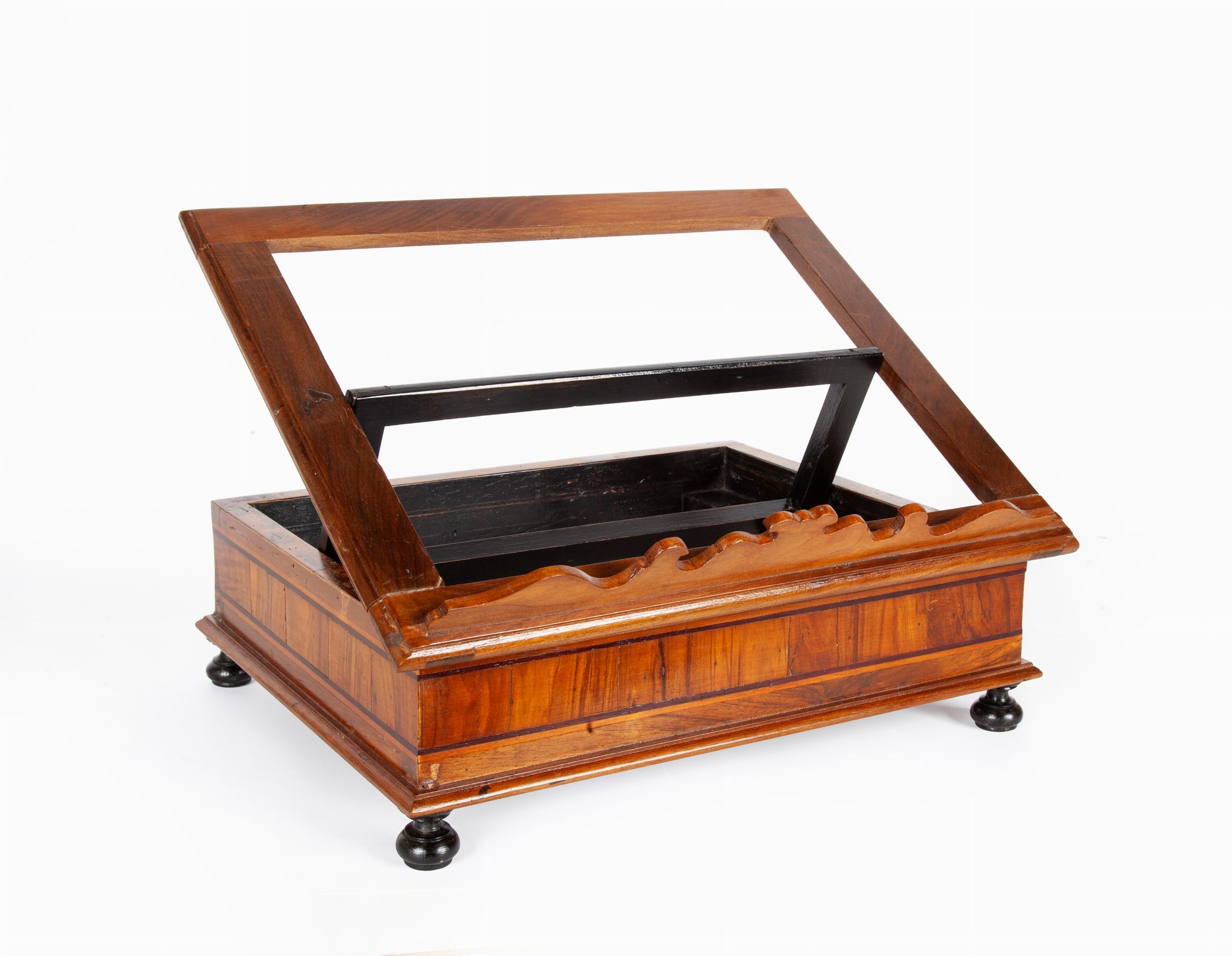 con filettature intarsiate in legno di frutto naturale e tinto; piano inclinabile, piedi a trottola