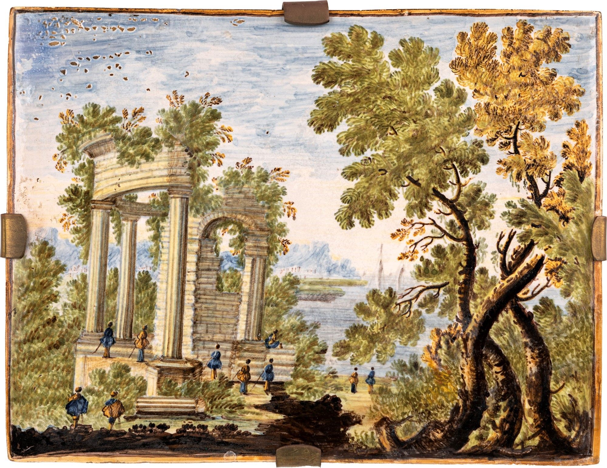 cm 20,5x27 raffigurante un paesaggio lacustre con figure, resti di tempio classico a sinistra ed alberi a destra. Al verso vecchia etichetta di provenienza Schubert Antichità Milano