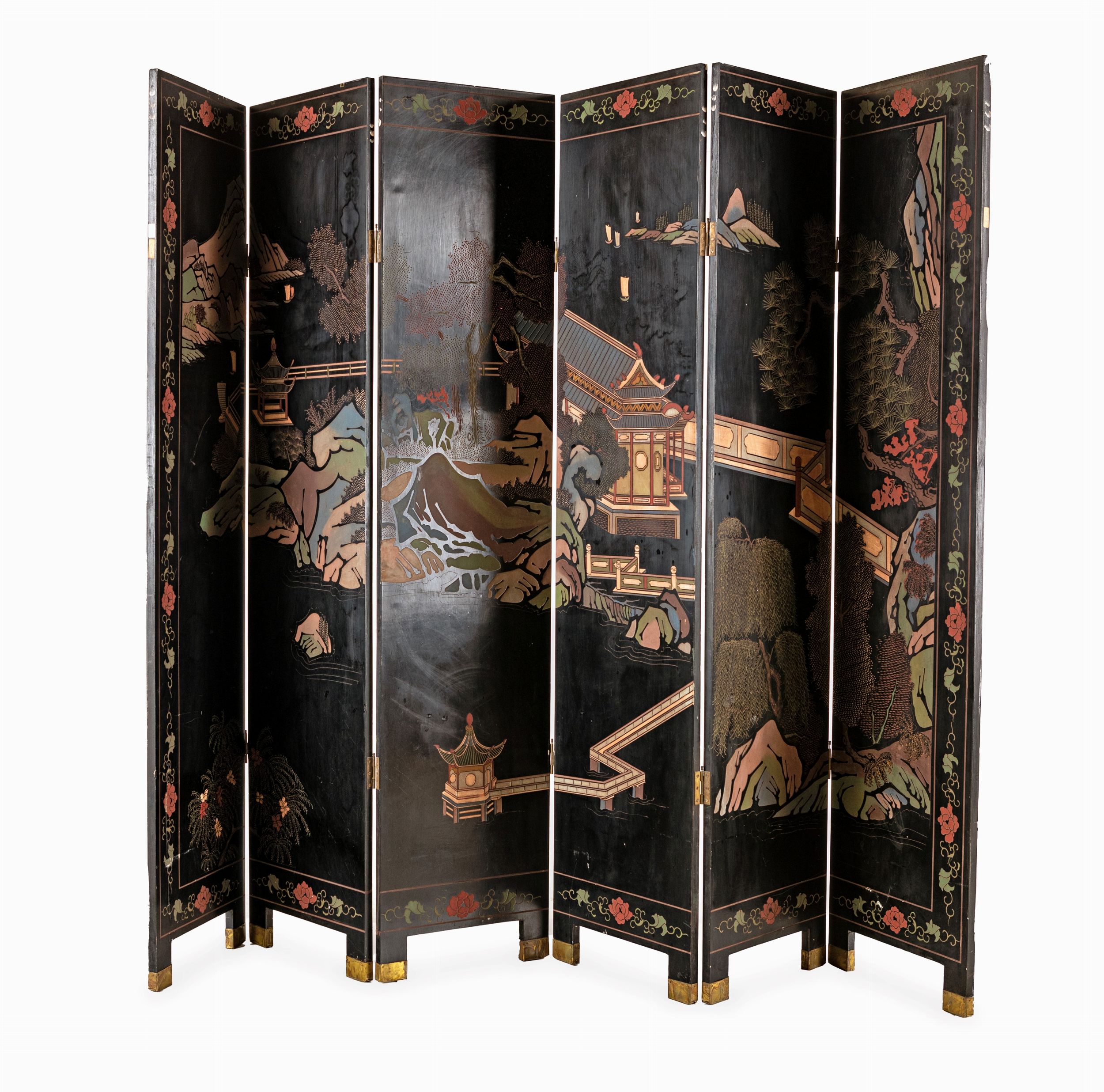 Paravento a sei ante in legno laccato nero, Giappone, inizi del XX secolo