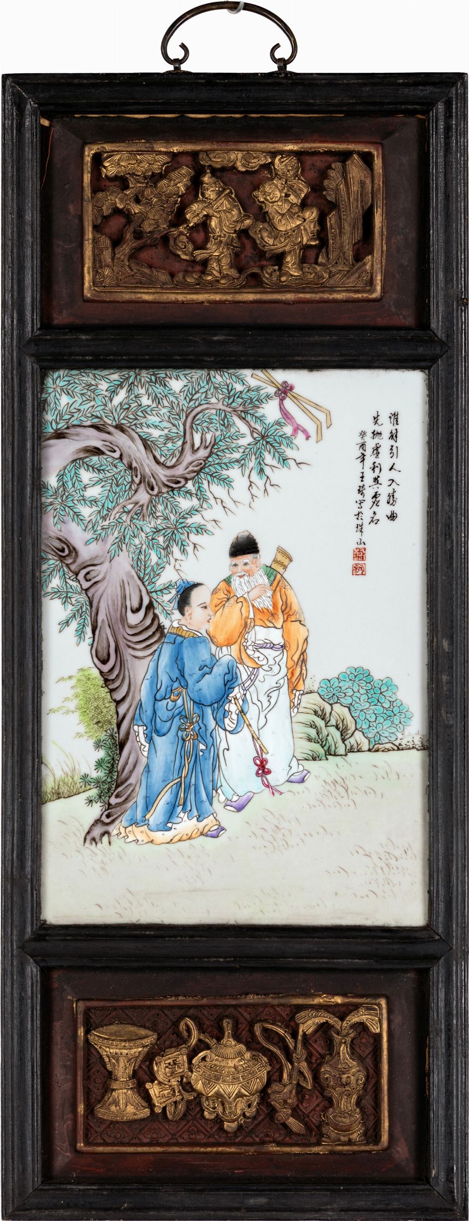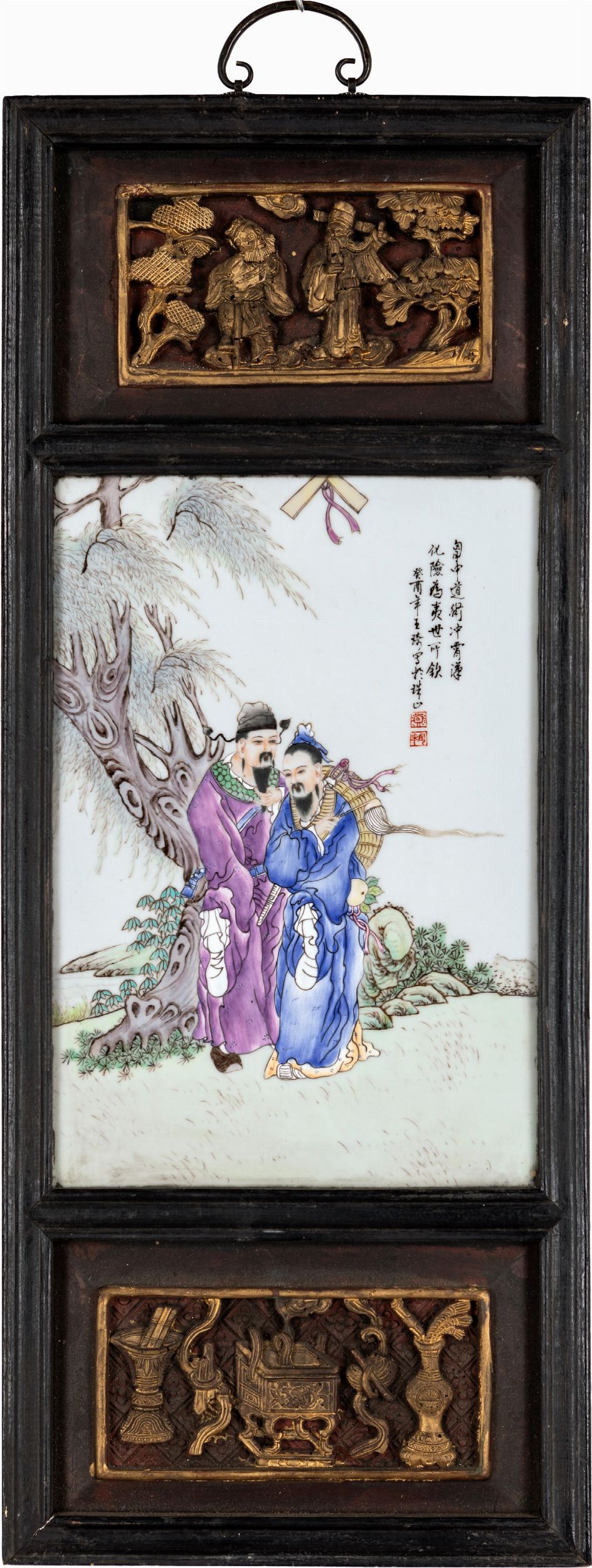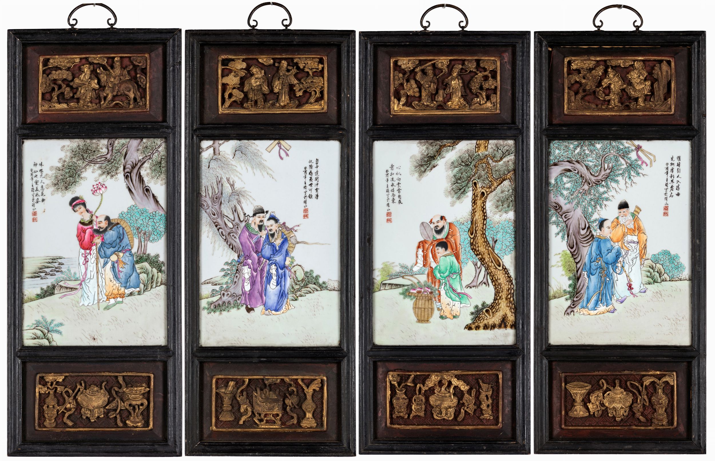 Quattro pannelli in legno intagliato con placche porcellana, Cina, fine dinastia [..]