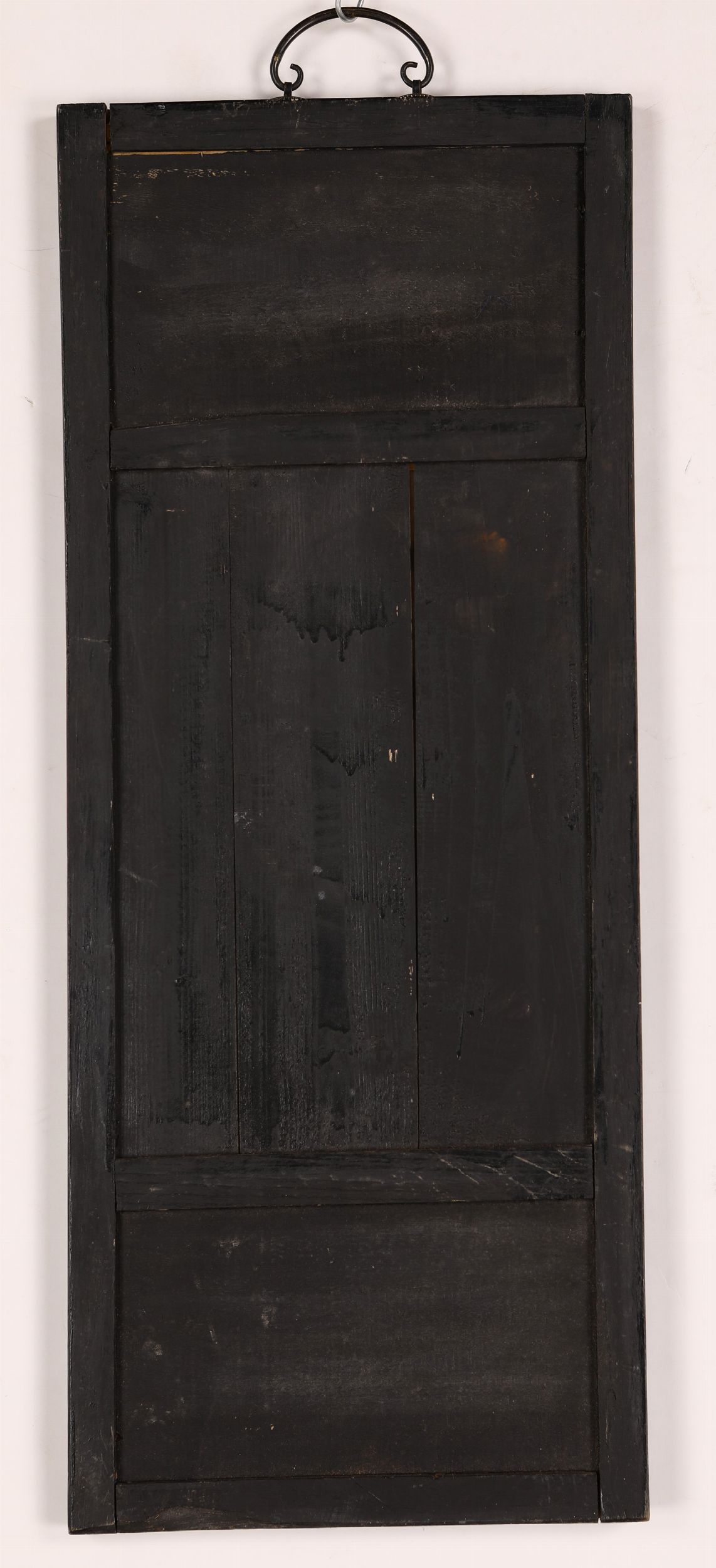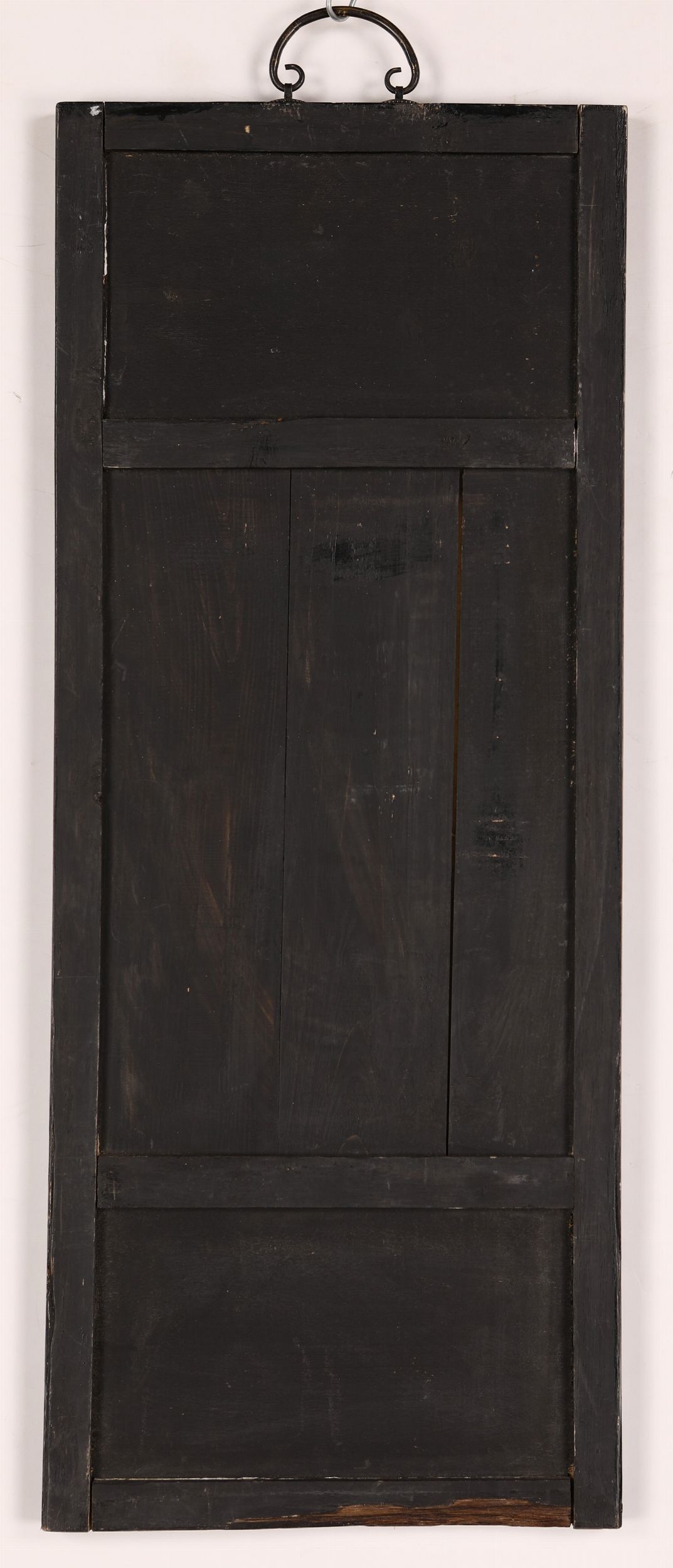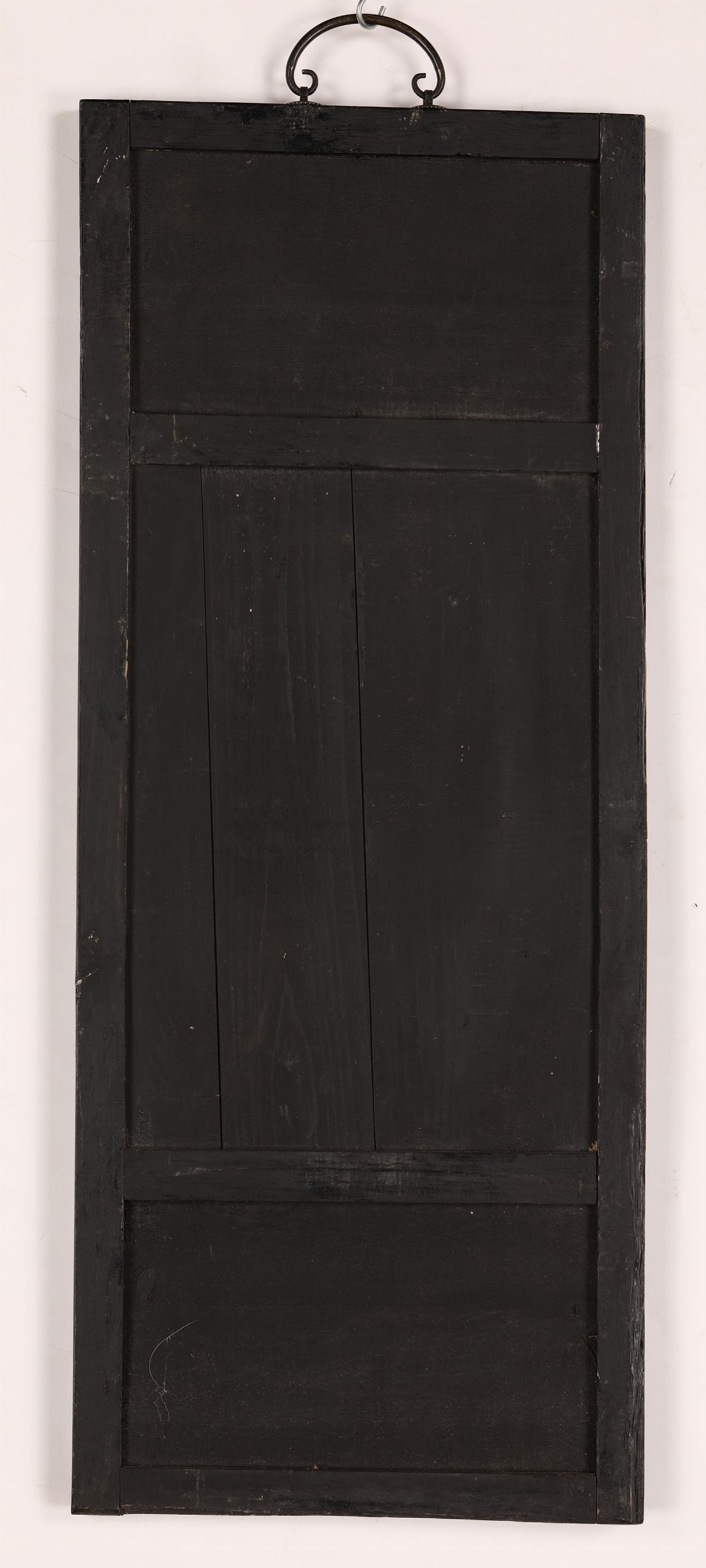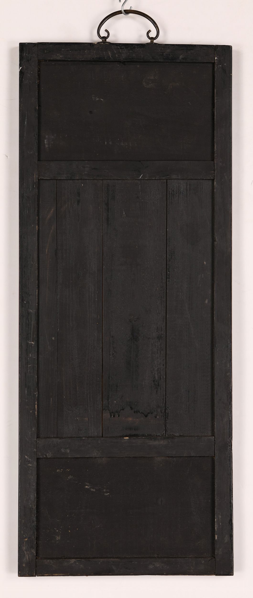 cm 72x29 ognuna - misura comprensiva di attaccaglia cm 77 ogni placca è decorata da personaggi ed iscrizioni; la parte lignea è caratterizzata da formelle intagliate in altorilievo e dorate a raffigurare scene di genere e composizioni naturalistiche; sulla sommità attaccaglia ad anello in ottone dorato