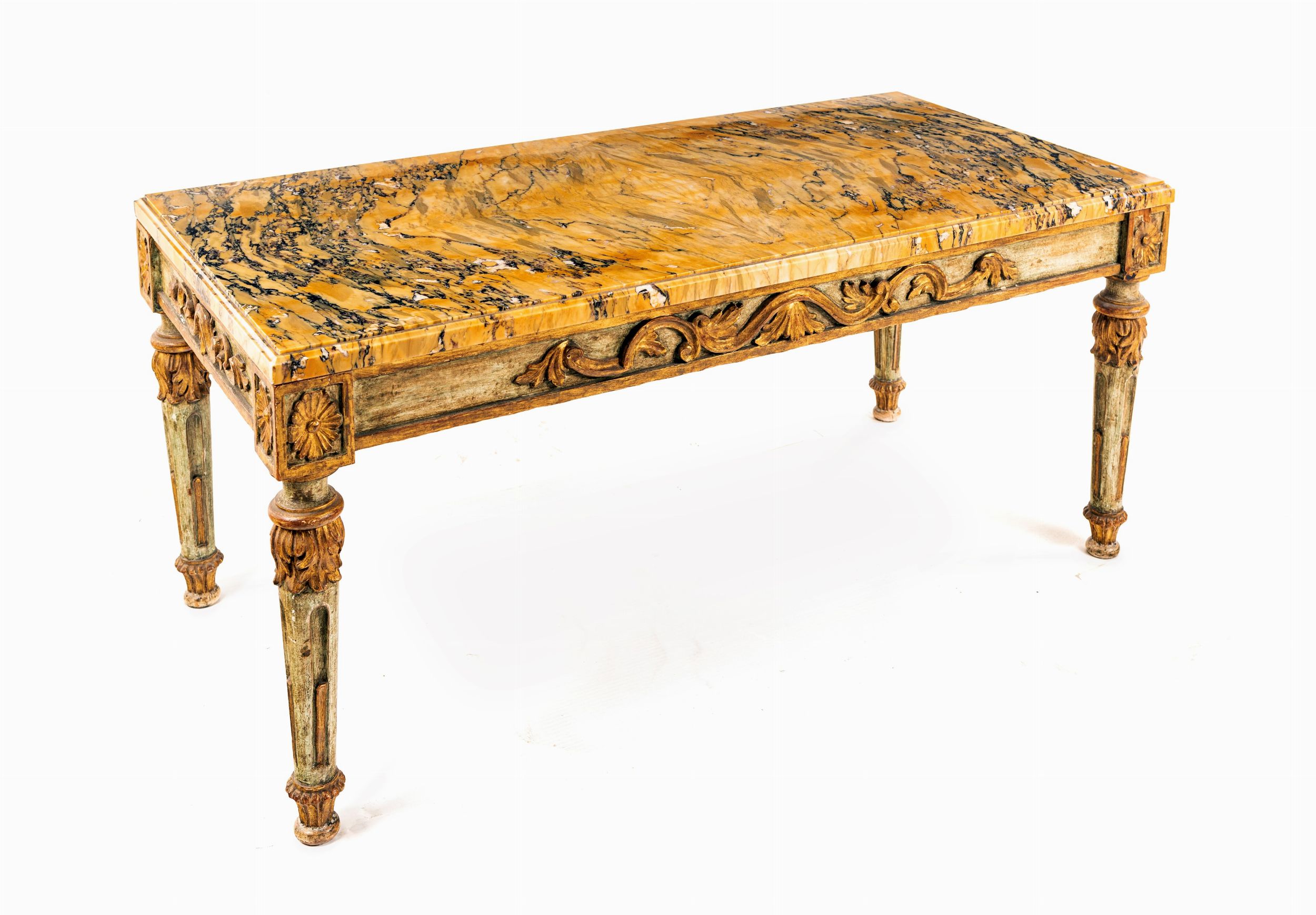 Tavolino basso in legno dipinto e dorato con piano lastronato in marmo giallo