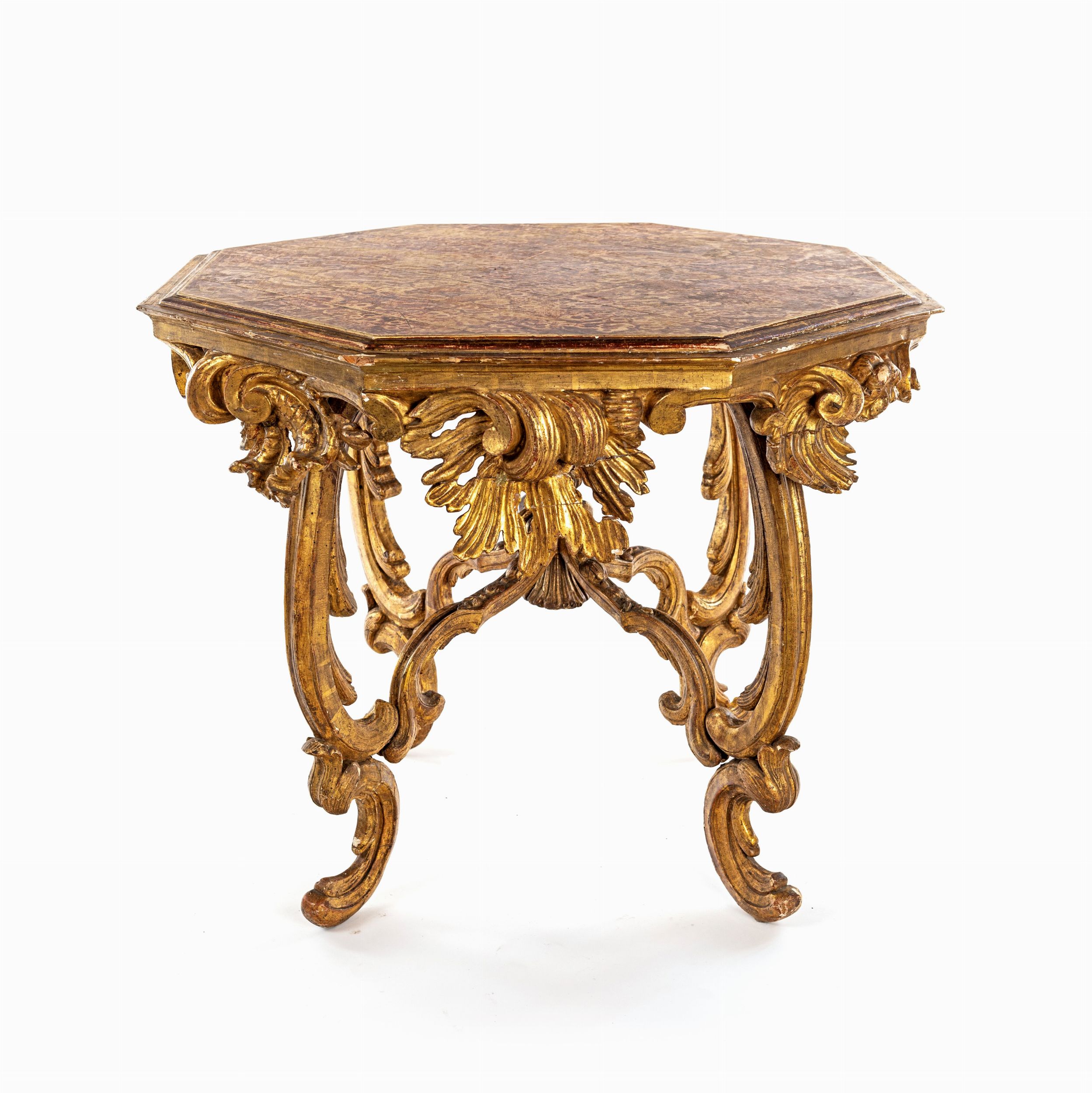 cm 73x86x86 piano ottagonale dipinto, sostenuto da quattro gambe incurvate terminanti a ricciolo riunite da traversa a crociera; elementi vegetali variamente scolpiti ed intagliati in forme diverse, sono diametralmente posti sotto al profilo del piano