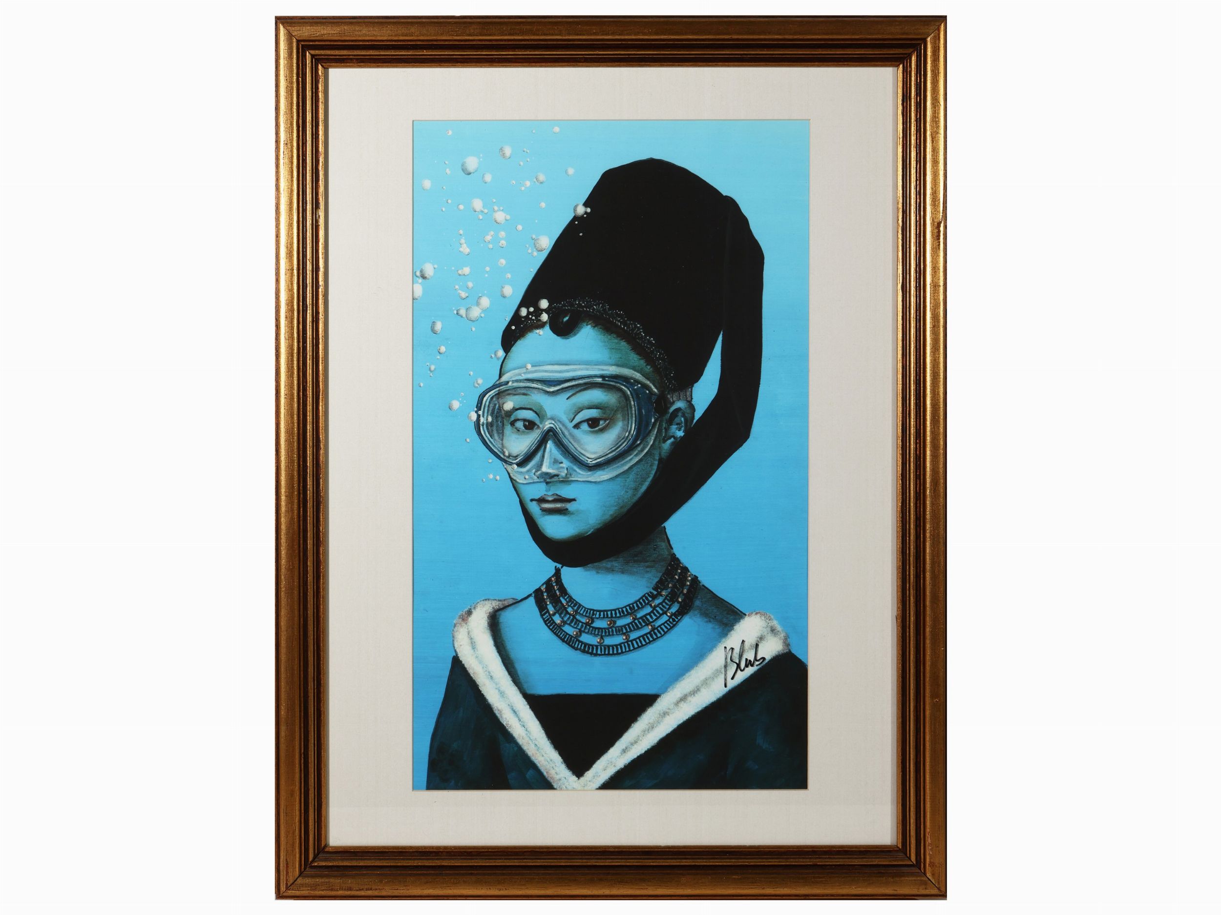 stampa a colori, firmata, in cornice, il margine superiore è applicato al passepartout con del nastro adesivo di carta