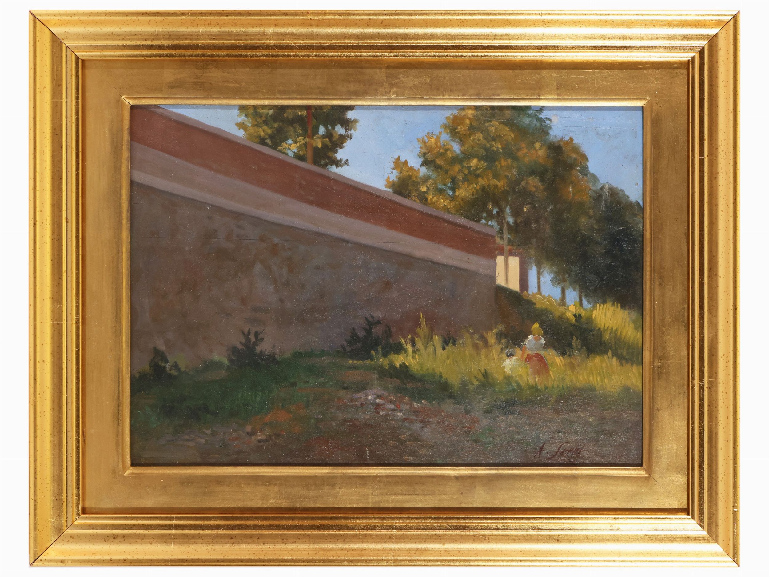 Veduta di parco con scorcio di muro e figure