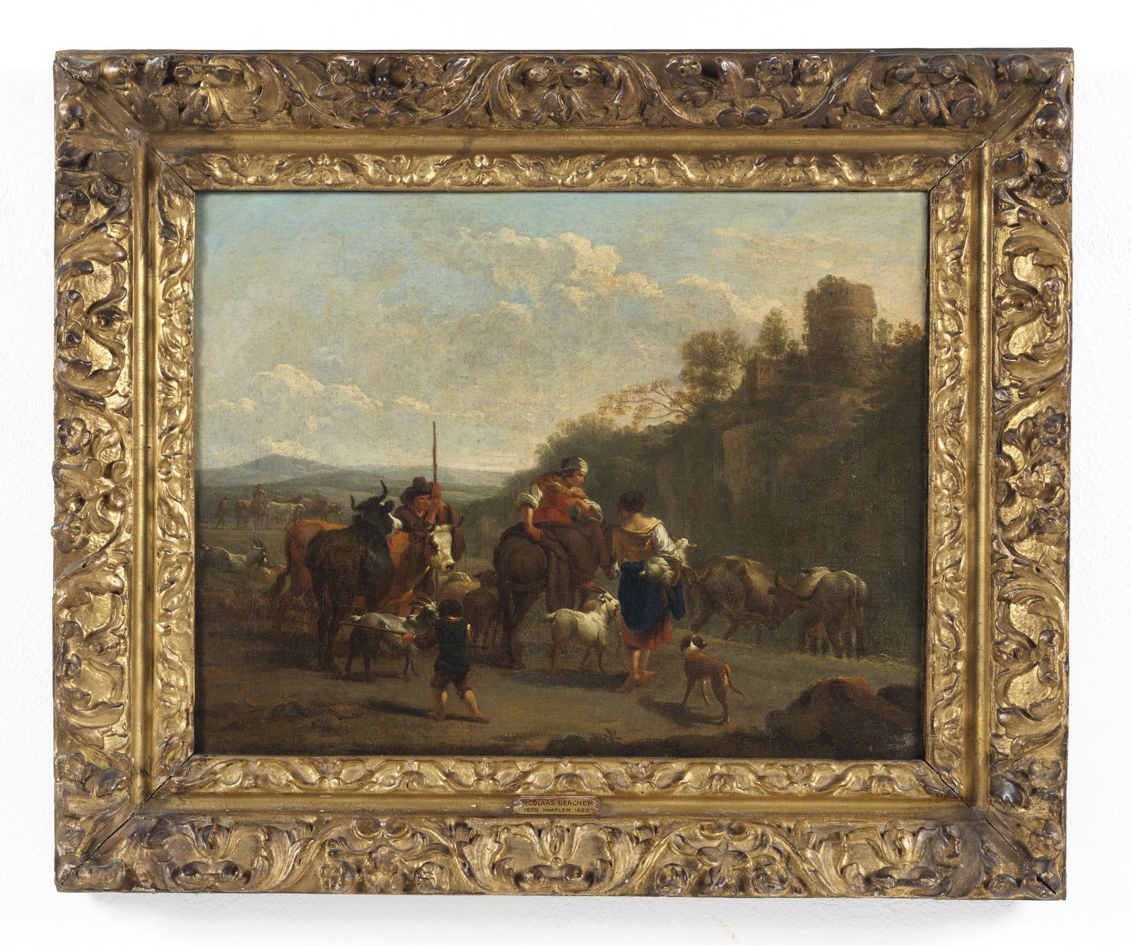 Attribuito a. Scena pastorale con contadini e armenti in un paesaggio