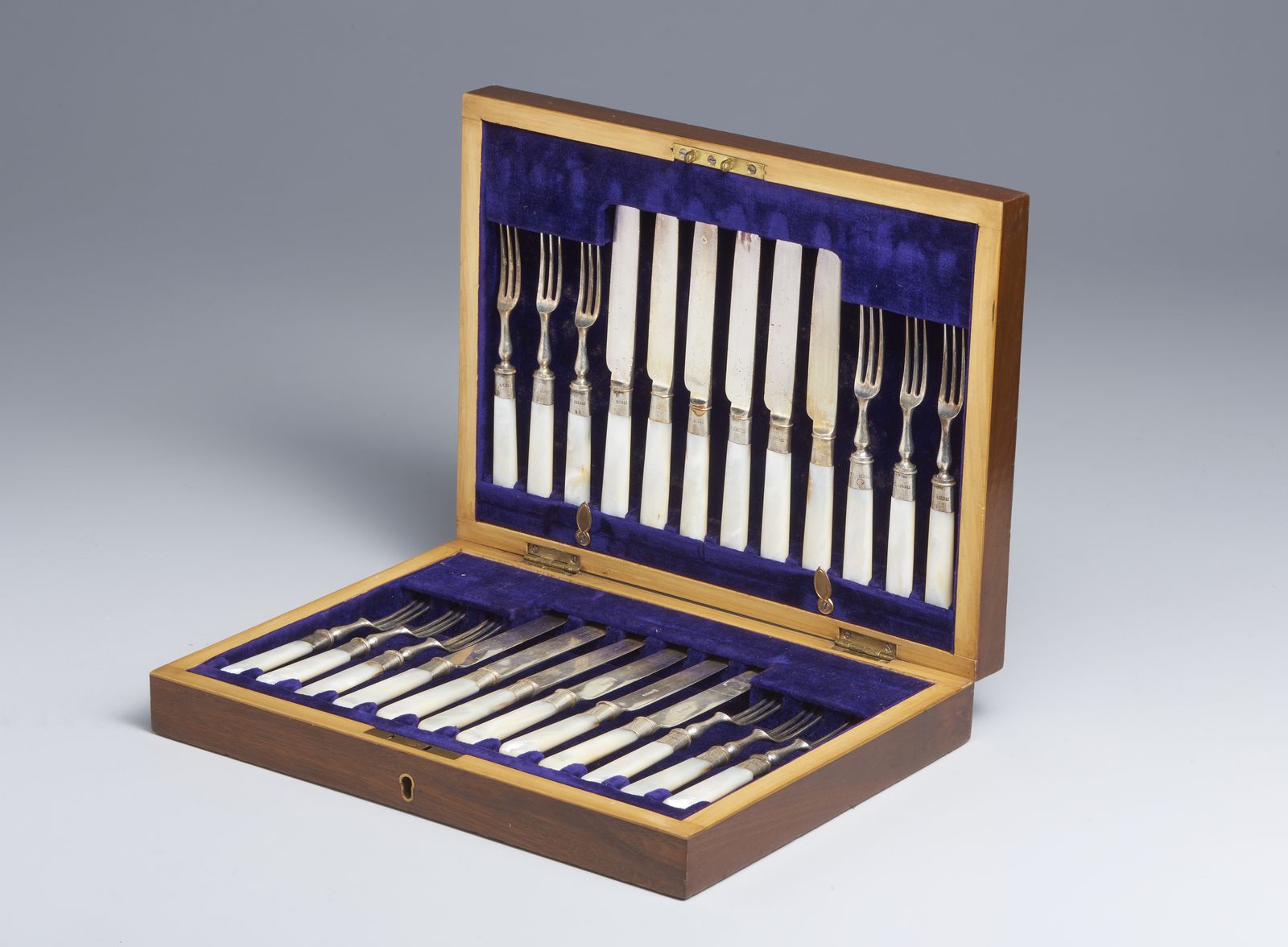 Servizio di 24 forchette e coltelli con manico in argento e madreperla, in contenitore [..]