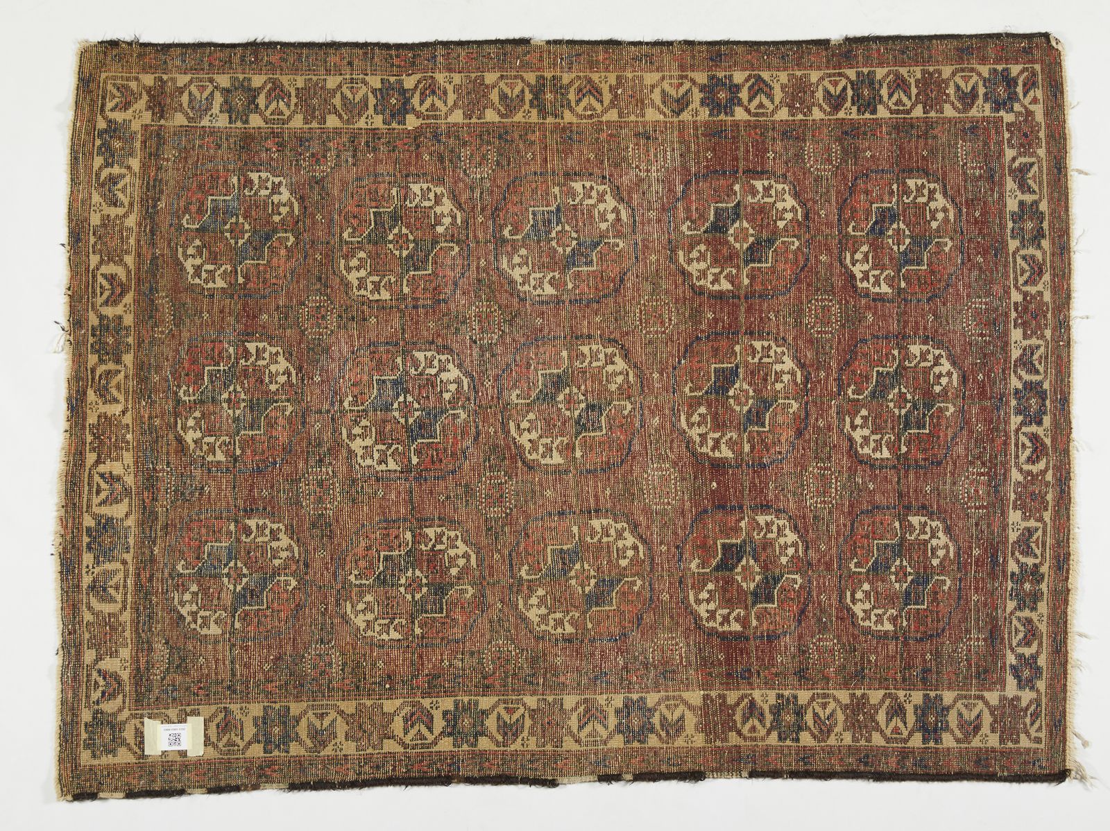 Tappeto con decorazione a medaglioni su fondo rosso inquadrato da fascia esterna, [..]