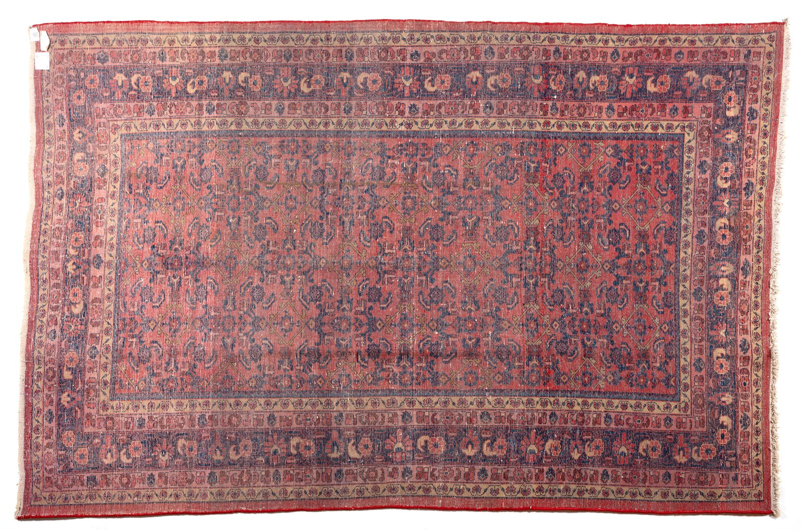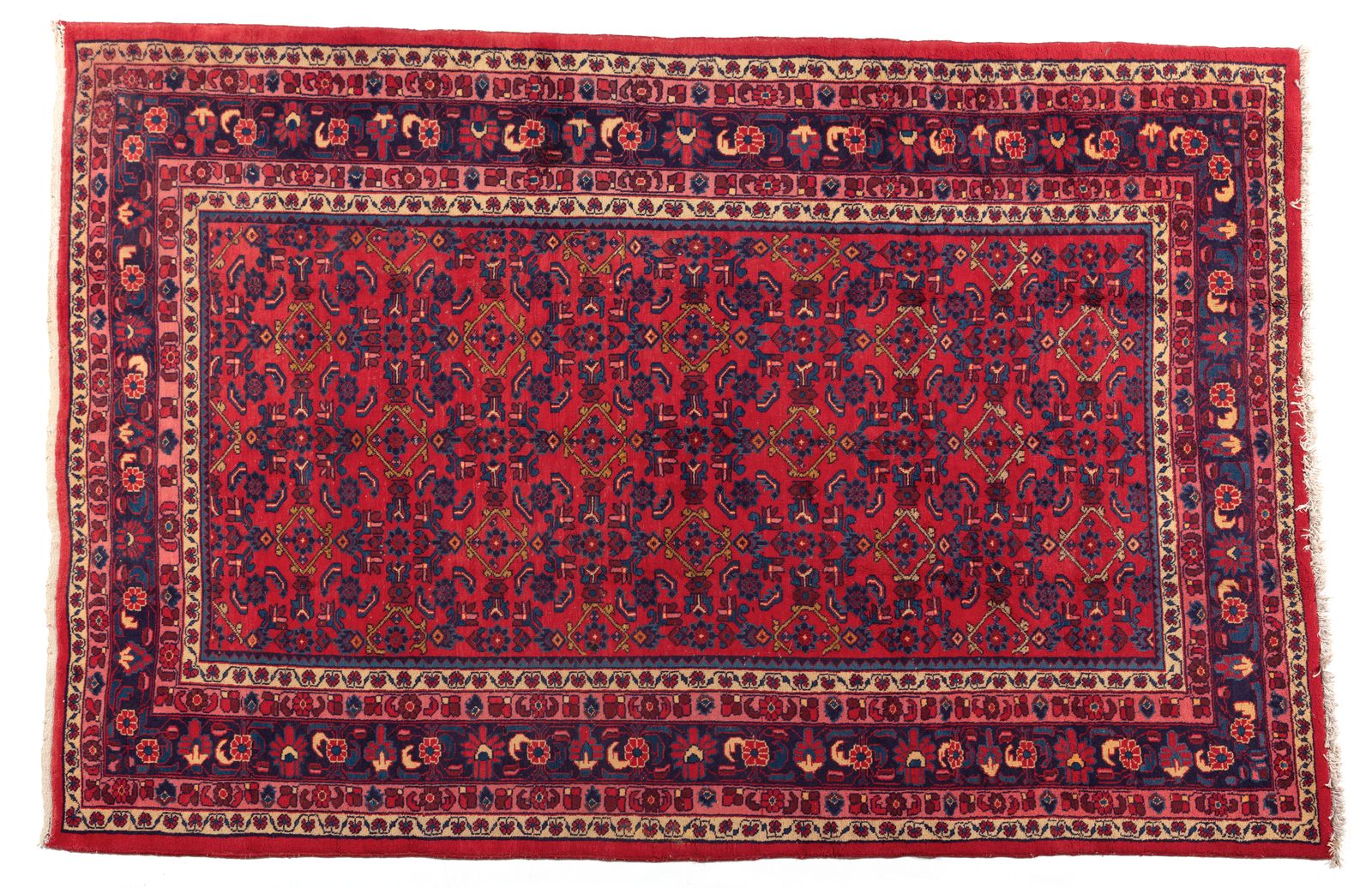 Tappeto persiano con cornici esterne e decorazioni geometriche su fondo rosso, 1950 [..]