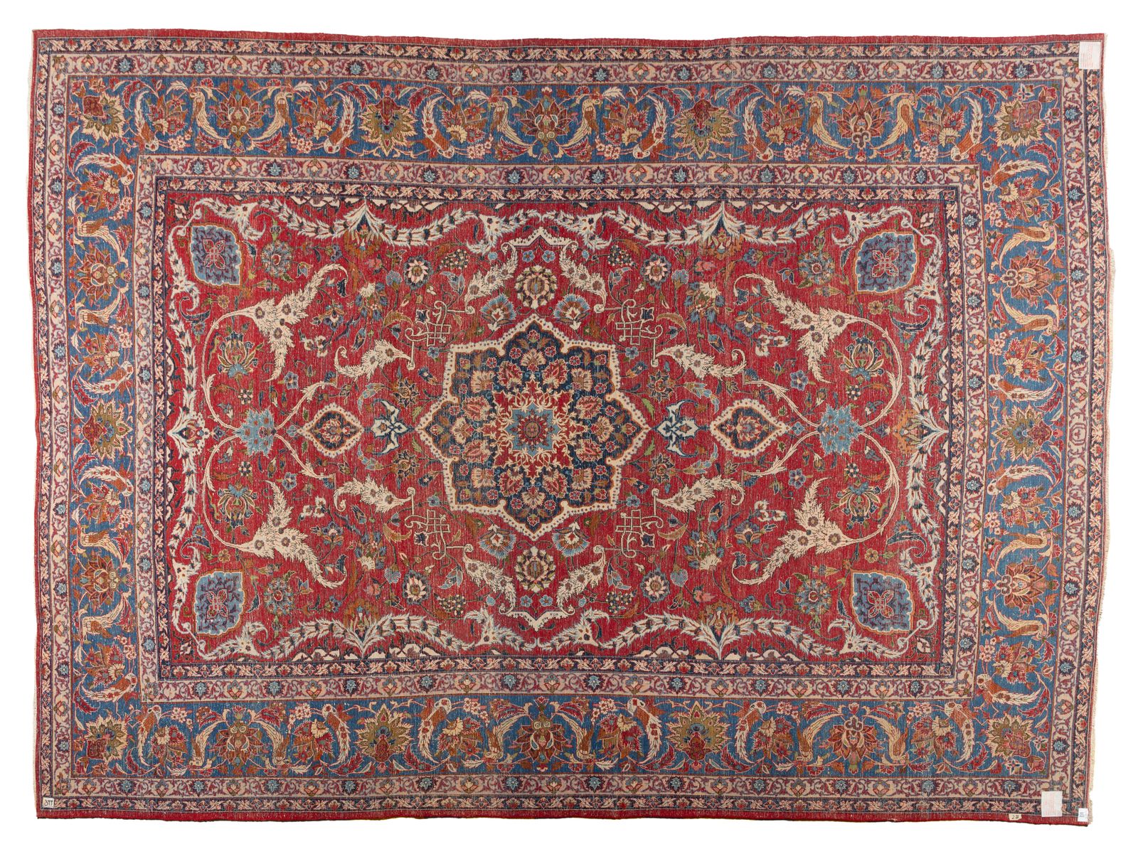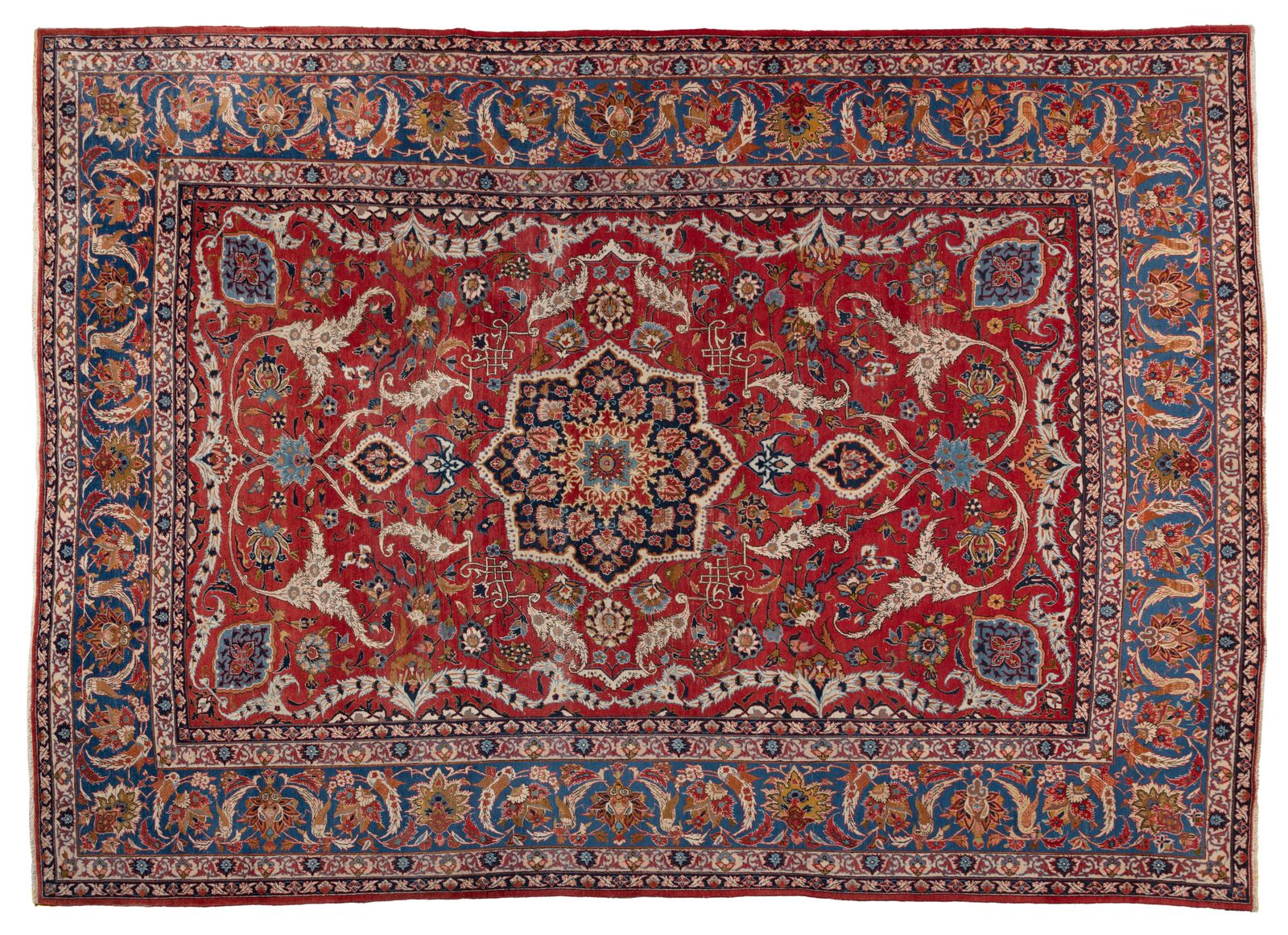 Tappeto persiano con medaglione centrale e motivi fitomorfi su campo rosso, inquadrato [..]