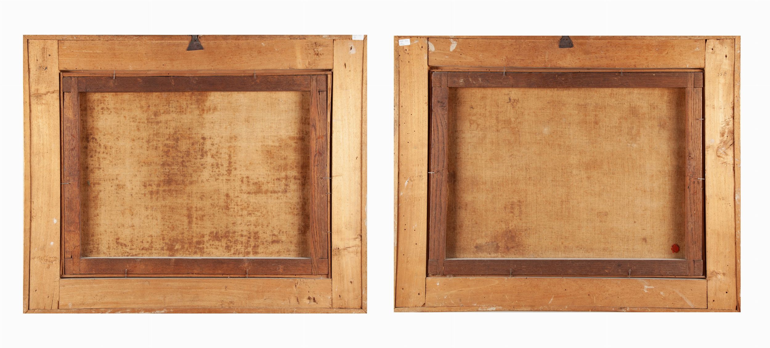 La coppia di paesaggi con figure si inserisce perfettamente in quella corrente artistica, iniziata a Roma da Carracci e i suoi scolari come Francesco Albani, che poneva come punto cardinale nel dipinto il paesaggio e non più le figure umane. Nei nostri dipinti le figure che li animano sembrano essere aspetti secondari della composizione, mentre l’occhio dello spettatore si disperde tra le quinte architettoniche formate da arbusti, alberi agitati dal vento, nuvole che si stagliano su un cielo terso e rocce. Tra i più grandi interpreti di questo genere è da annoverare Gaspar Dughet, elegante artista di origine francese, assai vicino a Nicolas Poussin, che seppe conquistarsi un posto di prim’ordine con i suoi dipinti nelle gallerie principesche romane e non solo. Per la vicinanza stilistica i due paesaggi qui presentati dichiarano una evidente ascendenza nei confronti del Dughet, che ci induce ad attribuirli ad un suo stretto collaboratore.