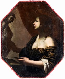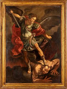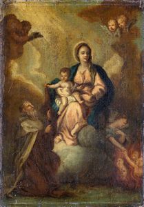 olio su tela, cm 48,5x34,5 s.c. La Madonna, seduta su un trono di nuvole col Bambino in braccio; ai loro piedi, [..]