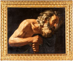 olio su tela, cm 70x87 - con cornice cm 91x109 Un fascio di luce illumina il potente braccio, la fronte raggrinzita [..]