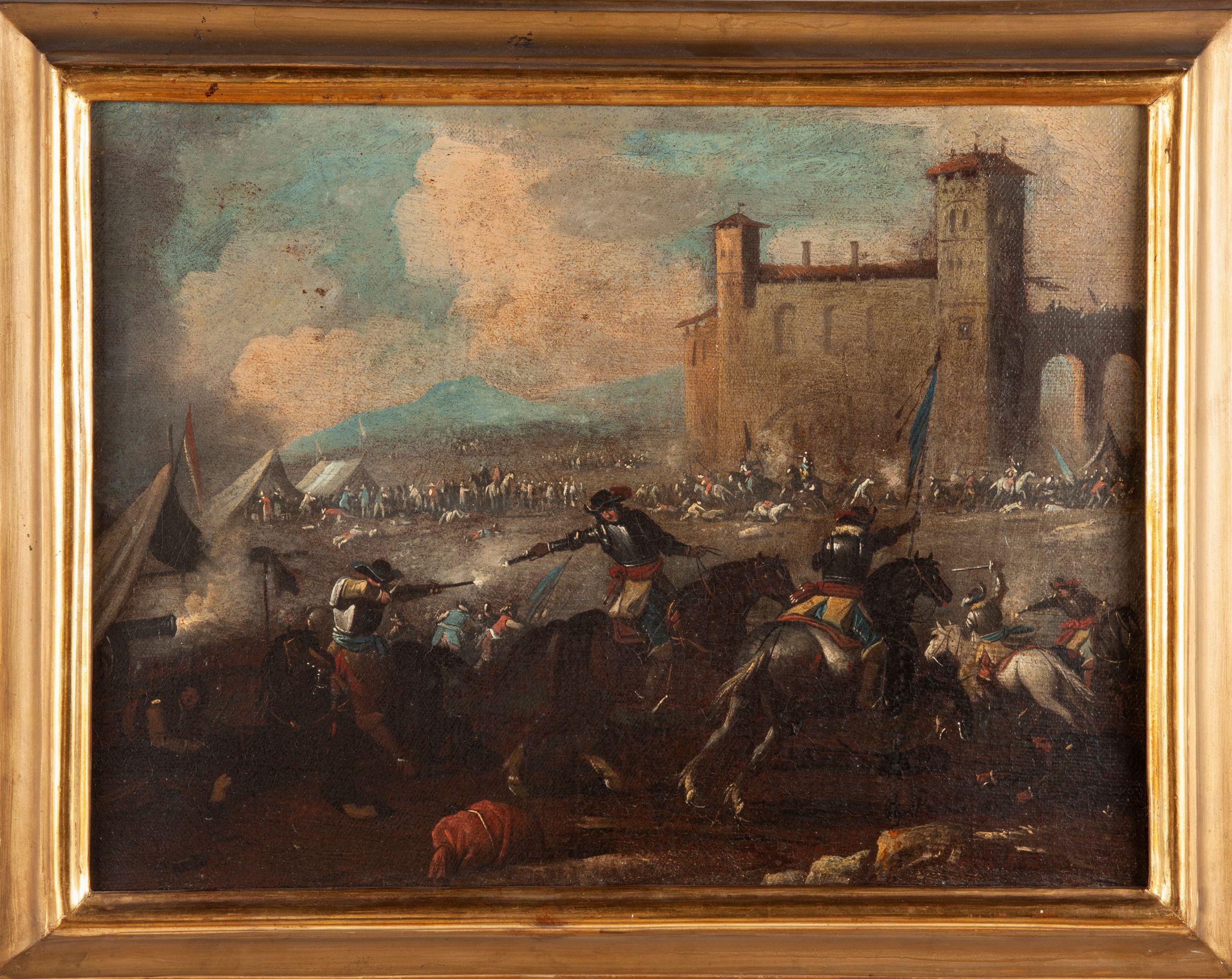 La tela raffigura uno scontro tra cavalieri con armi da fuoco, con gli stendardi che garriscono al vento e si stagliano su un cielo carico di nubi, di fronte ad un accampamento militare e le mura di un castello. La scena è ripresa in primo piano, escamotage tipico delle battaglie dipinte da Francesco Monti, in modo da far sentire lo spettatore come testimone diretto della scena cui sta assistendo, a cui si aggiungono una grande vivacità cromatica, il gioco di varie prospettive e un’attenta regia scenica. Per questi motivi il nostro dipinto può dirsi opera di un artista proveniente dalla bottega del Monti.
