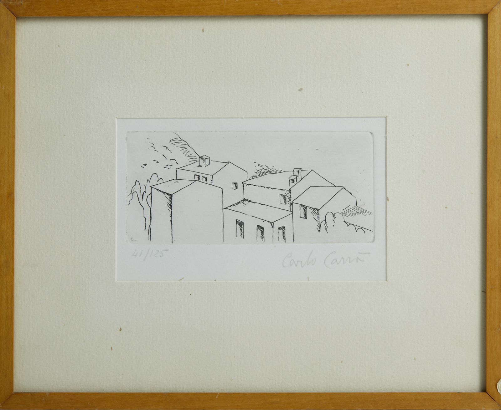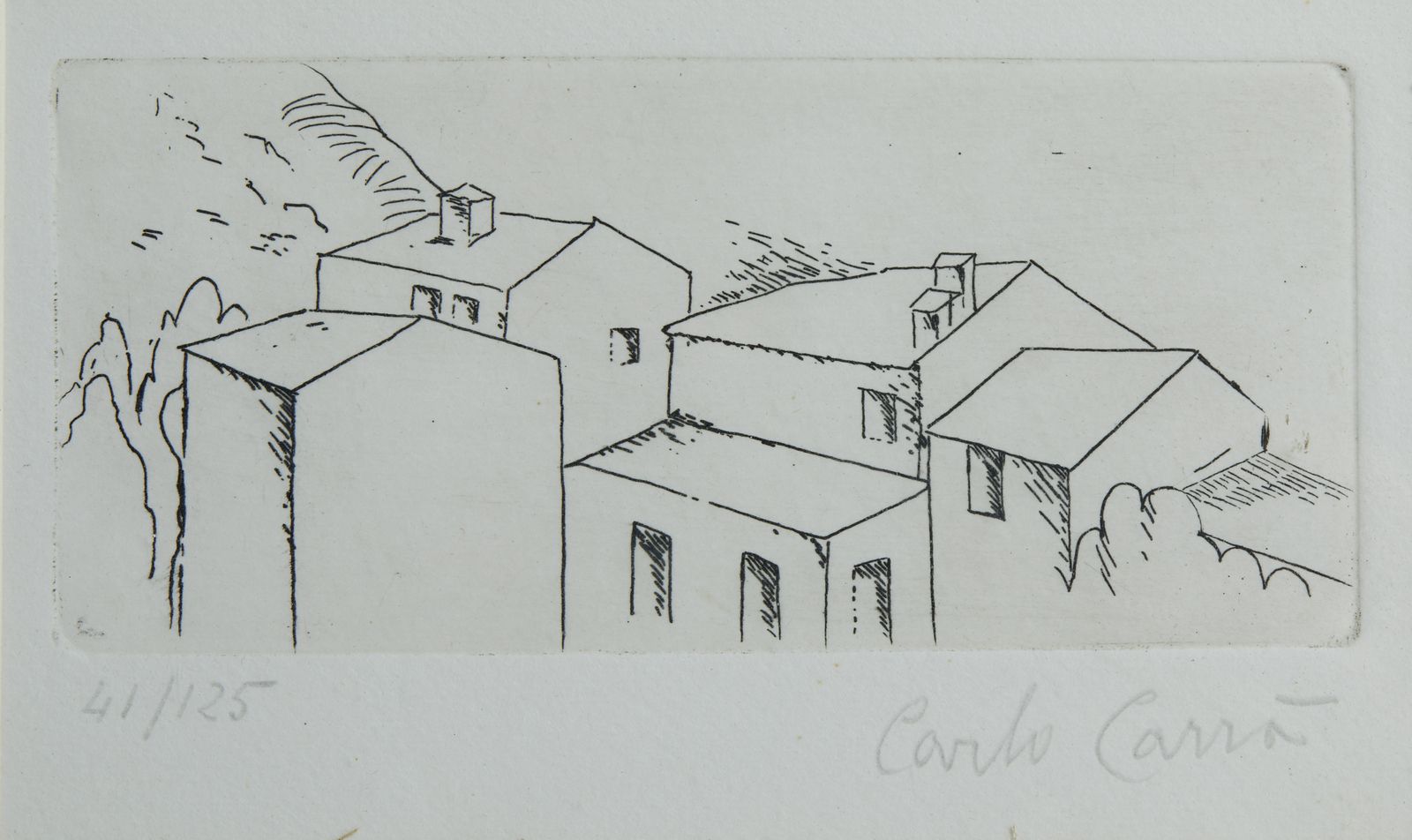 41/125. Tiratura e firma in basso a matita. Al retro cartiglio Studio Ghiglione, Genova. Dimensione lastra: 6x12.5 cm. Edizione totale: 125 esemplari numerati da 1 a 125 + XV esemplari numerati da I a XV. Pubblicazione: M. Carrà, Carlo Carrà: opera grafica (1922-1964), Neri Pozza Editore, Vicenza 1976, n° 8. 1922-1957.