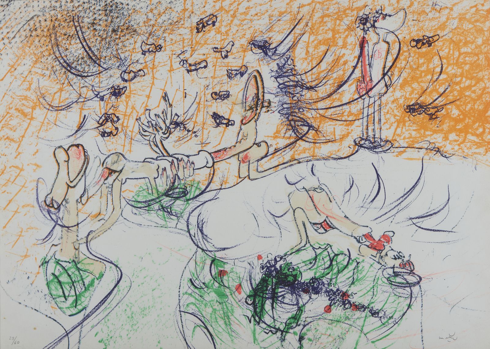 29/60. Tiratura e firma in basso a matita. L'opera proviene dalla cartella Haec Fabula Proponitur composto da n. 6 litografie. Edizione totale: 60+XX esemplari. Carta Magnani di Pescia. Pubblicazioni: Il Bisonte. Litografie e incisioni, Firenze, 1983, dal n. 402 al 407. 1969-1970. Cartella non completa.
