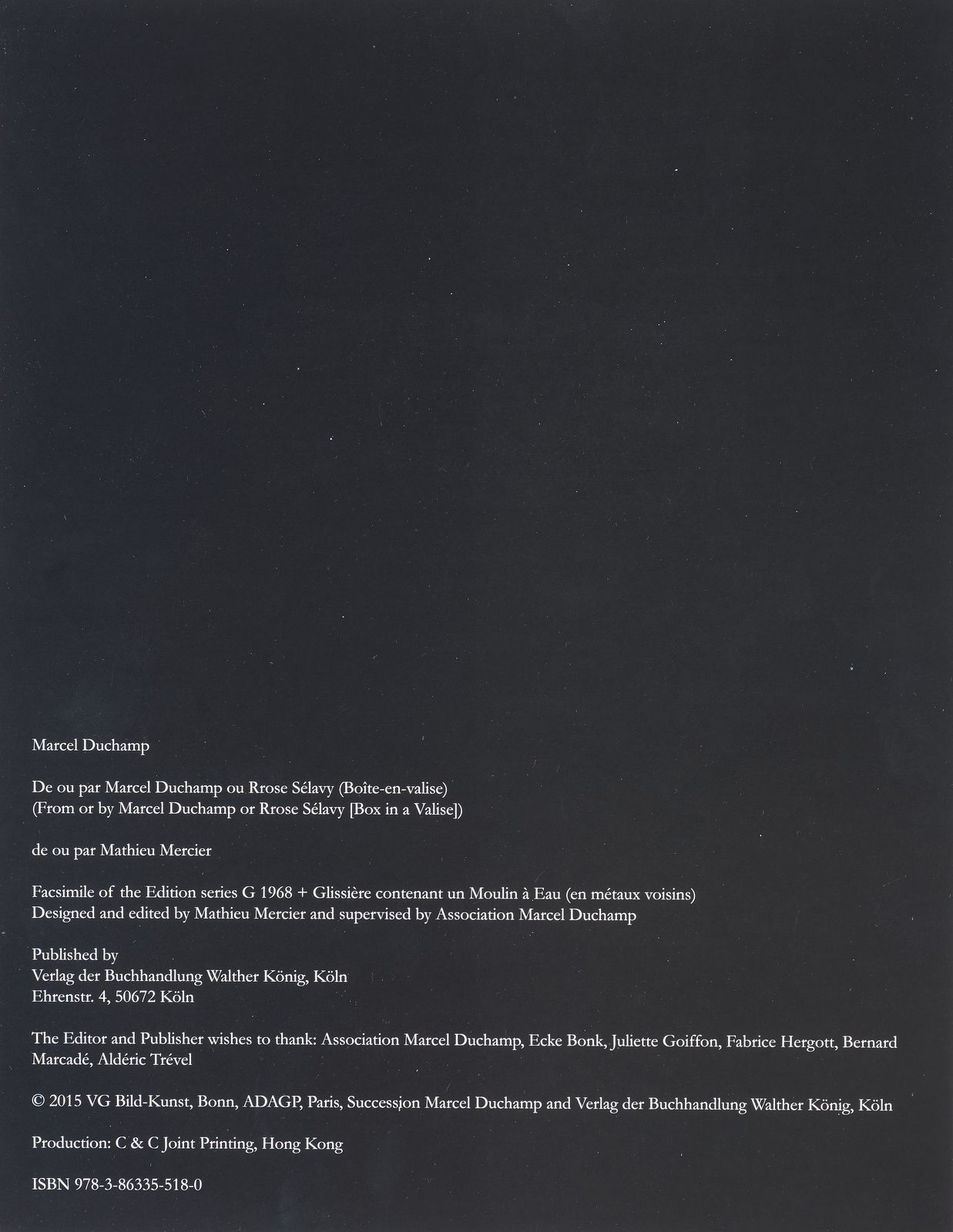 Facsimile dell'Edizione serie G 1968 + diapositiva con Mulino ad Acqua. Progettato e edito da Mathieu Mercier, supervisione dell'Associazione Marcel Duchamp. Pubblicato da Verlag der Buchhandlung Walther König, Köln.Dimensioni da aperta: 37x37x83 cm. 'Tutto ciò che di importante ho fatto può essere messo in una piccola valigia', ( Duchamp,1952).Uno dei pezzi più importanti ed enigmatici dell'arte moderna, 'Boîte-en-valise' è stato assemblato da Marcel Duchamp tra il 1935 e il 1941. La valigia portatile contiene 'la somma del suo lavoro artistico' proprio fino a quella data ( edizione totale in 300 copie).Questa è la prima reinterpretazione dell'iconico oggetto-libro, concettualizzato dall'artista francese Mathieu Mercier .Un'opera in pieno spirito duchampiano: questo museo in miniatura contiene 69 riproduzioni delle creazioni più celebri di Duchamp.