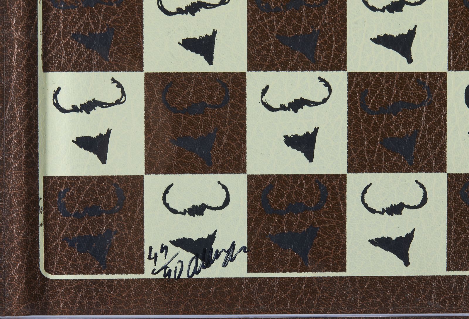 44/90. Tiratura e firma in basso a sinistra a pennarello. Serigrafia su pelle Skivertex. Editore: Philadelphia Museum of Art. Edizione totale: 90 esemplari. Entro teca in plexiglass. Dimensioni teca: 40.5x40.5x3.8 cm.