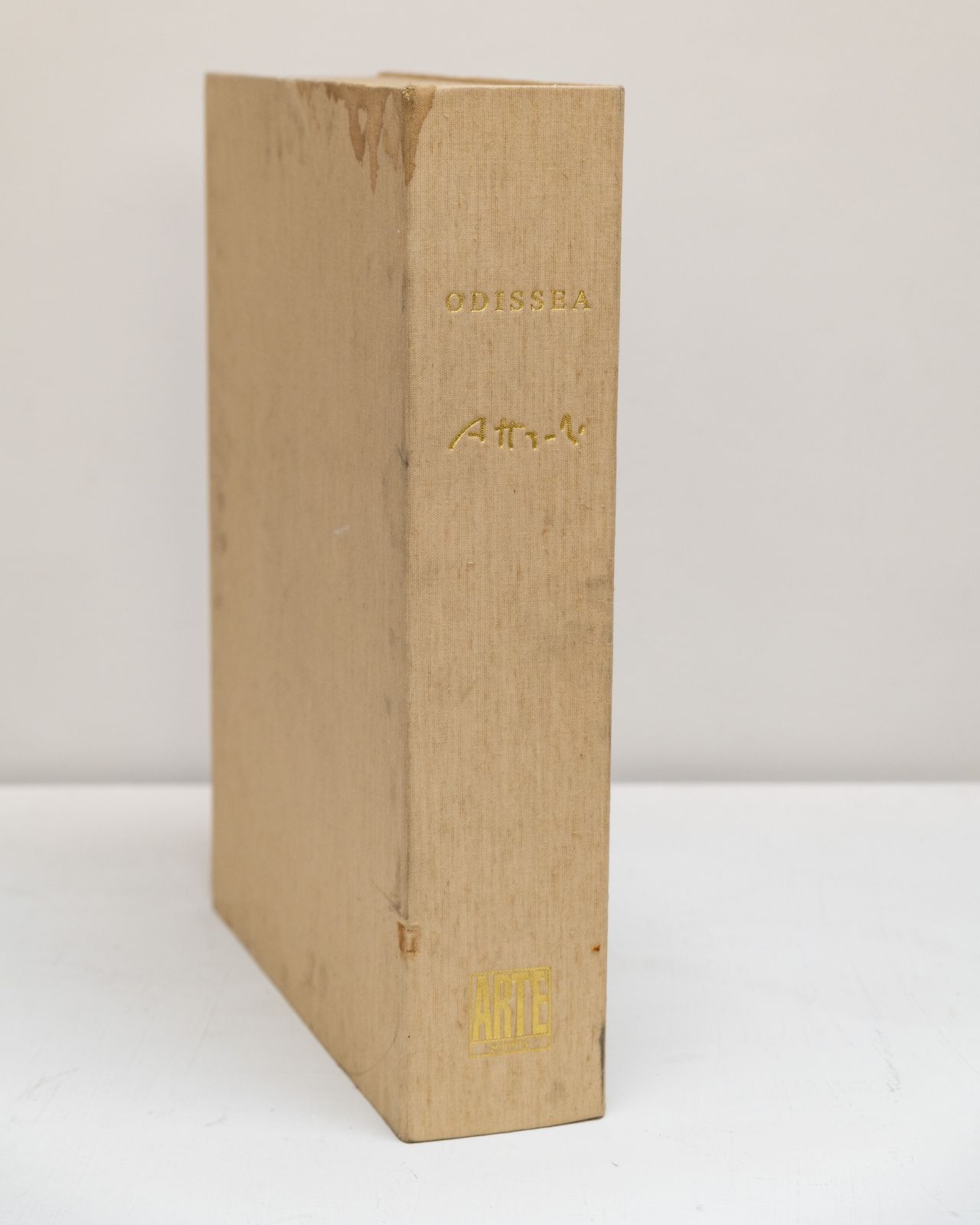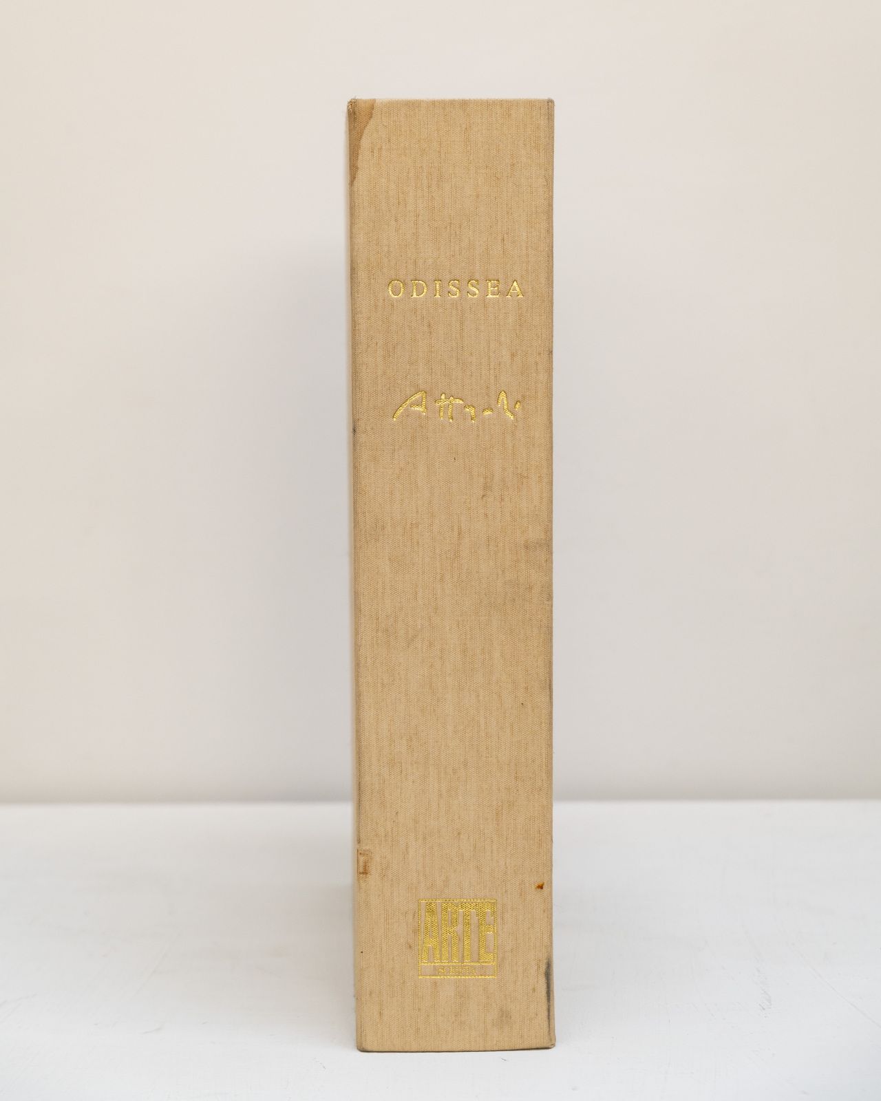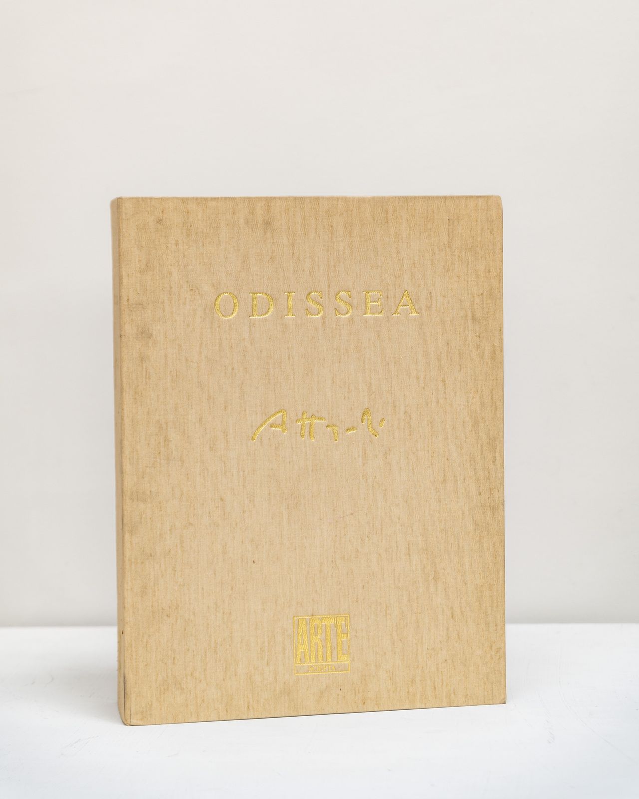 228/975. Tiratura e firma in basso sulla copertina. Tiratura e firma nel colophon. Libro d'artista composto da 14 tavole a colori fuori testo testo e 27 illustrazioni in bianco e nero nel testo. In copertina: Il volto di Ulisse, Ugo Attardi, serigrafia su lastra di acciaio bagnato in oro. Stamperia: Monotipia Olivieri, Milano. Carta BFK Rives delle cartiere d'Arches. Le 14 tavole fuori testo sono state stampate su carta BFK Rives presso la Stamperia d'Arte Arte 3, Milano. Edizione totale: 975+LXXV esemplari. Confezione originale. Editore: FMR-Art'é, Bologna. Dimensioni libro: 46x34.5x9 cm. Dimensioni libro aperto: 46.5x74 cm. Lievi difetti.