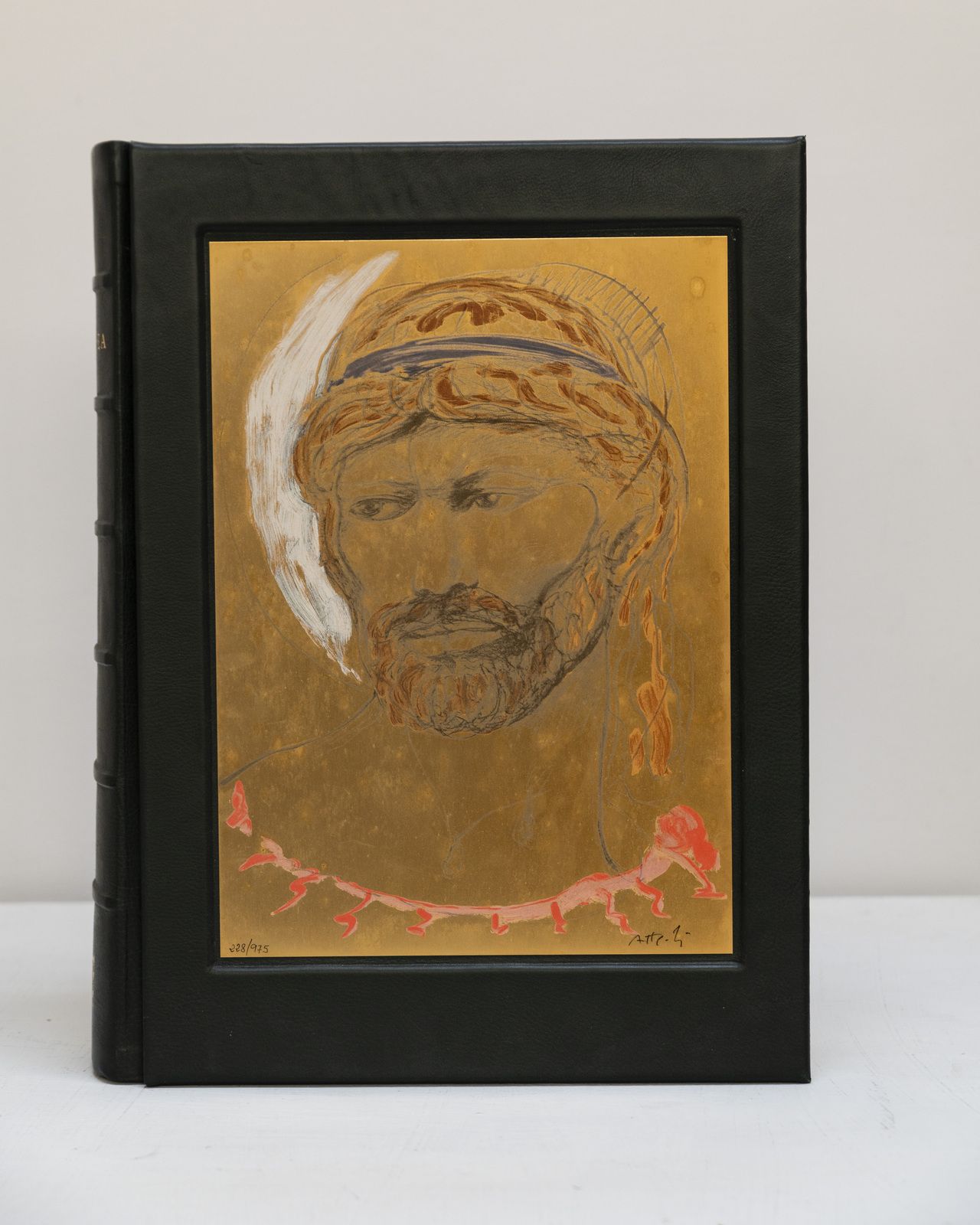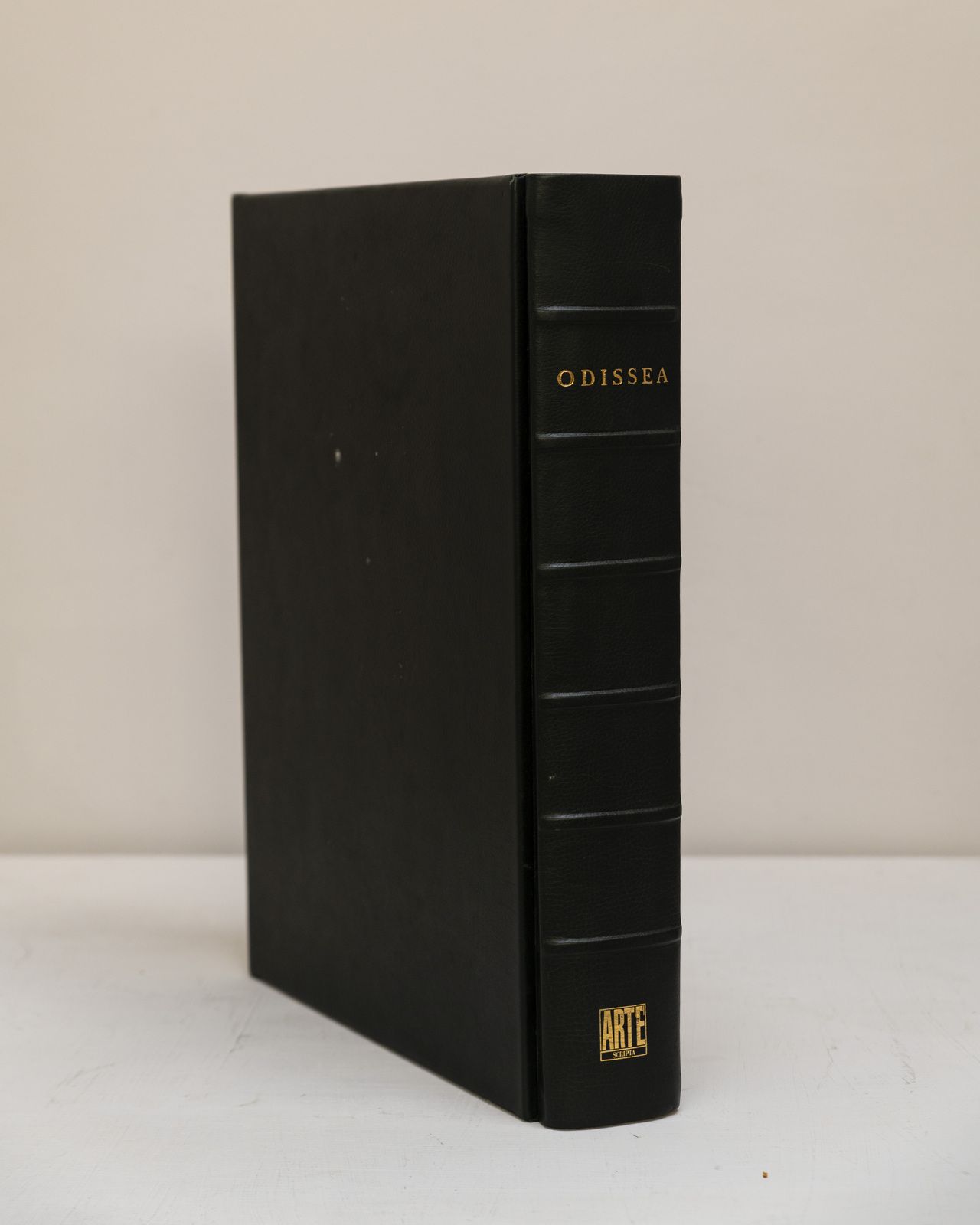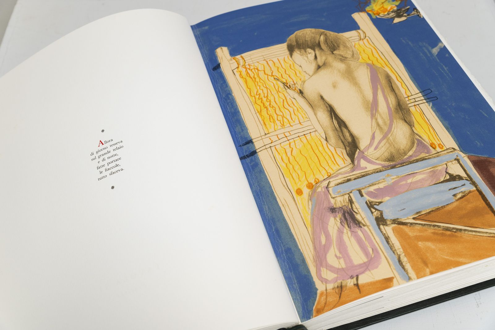 228/975. Tiratura e firma in basso sulla copertina. Tiratura e firma nel colophon. Libro d'artista composto da 14 tavole a colori fuori testo testo e 27 illustrazioni in bianco e nero nel testo. In copertina: Il volto di Ulisse, Ugo Attardi, serigrafia su lastra di acciaio bagnato in oro. Stamperia: Monotipia Olivieri, Milano. Carta BFK Rives delle cartiere d'Arches. Le 14 tavole fuori testo sono state stampate su carta BFK Rives presso la Stamperia d'Arte Arte 3, Milano. Edizione totale: 975+LXXV esemplari. Confezione originale. Editore: FMR-Art'é, Bologna. Dimensioni libro: 46x34.5x9 cm. Dimensioni libro aperto: 46.5x74 cm. Lievi difetti.