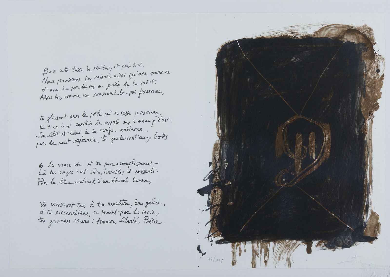 46/115. Tiratura e firma in basso a destra a matita. Carta BFK Rives. Editore e stampatore Erker-Presse, St-Gallen. Pubblicazioni: Antoni Tŕpies. Catalogo dell'opera grafica, a cura di Mariuccia Galfetti, Erker Presse, St. Gallen, n. 175.