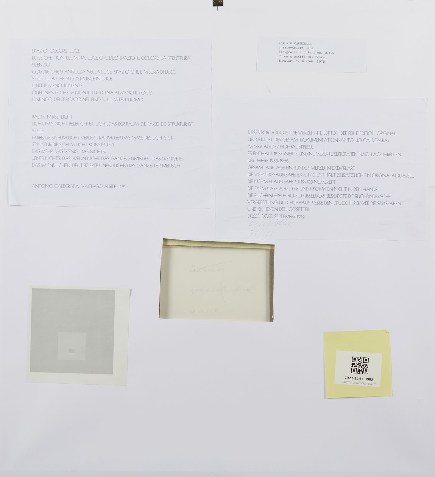78/108. Al retro tiratura e firma a matita. Edizione totale: 114 copie di cui 108 esemplari numerati da 19/108 a 108/108 + 18 esemplari in edizione speciale con acquerello originale + 6 esemplari numerati dalla lettera A alla FStampatori: H.P. Bayer.