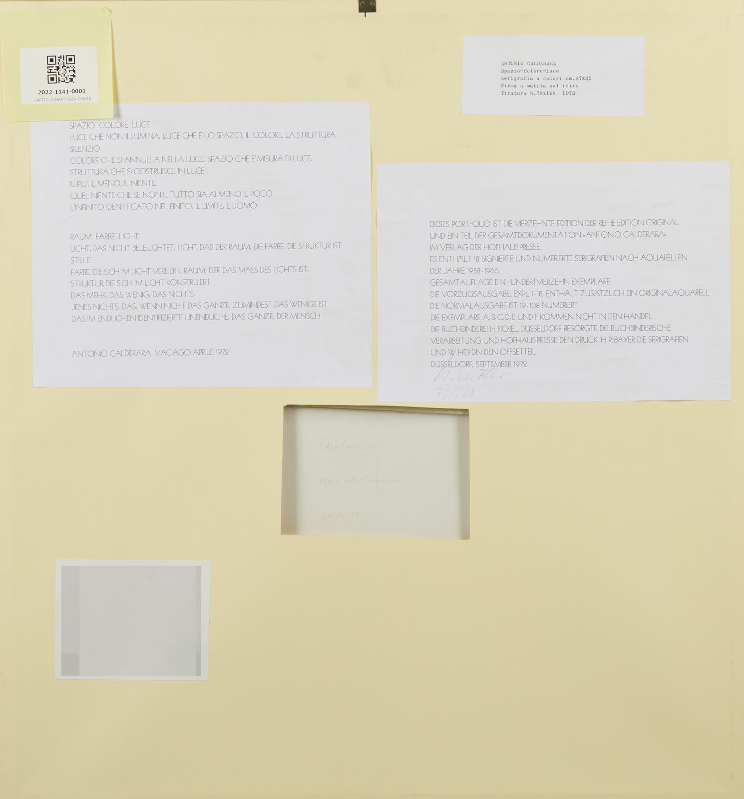 78/108. Al retro tiratura e firma a matita. Edizione totale: 114 copie di cui 108 esemplari numerati da 19/108 a 108/108 + 18 esemplari in edizione speciale con acquerello originale + 6 esemplari numerati dalla lettera A alla F. Stampatori: H.P. Bayer.