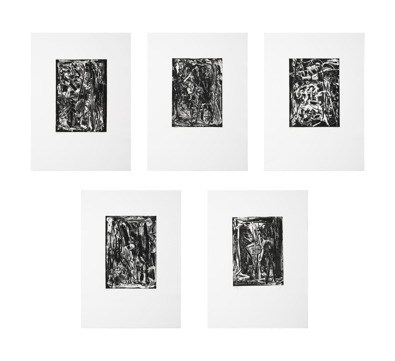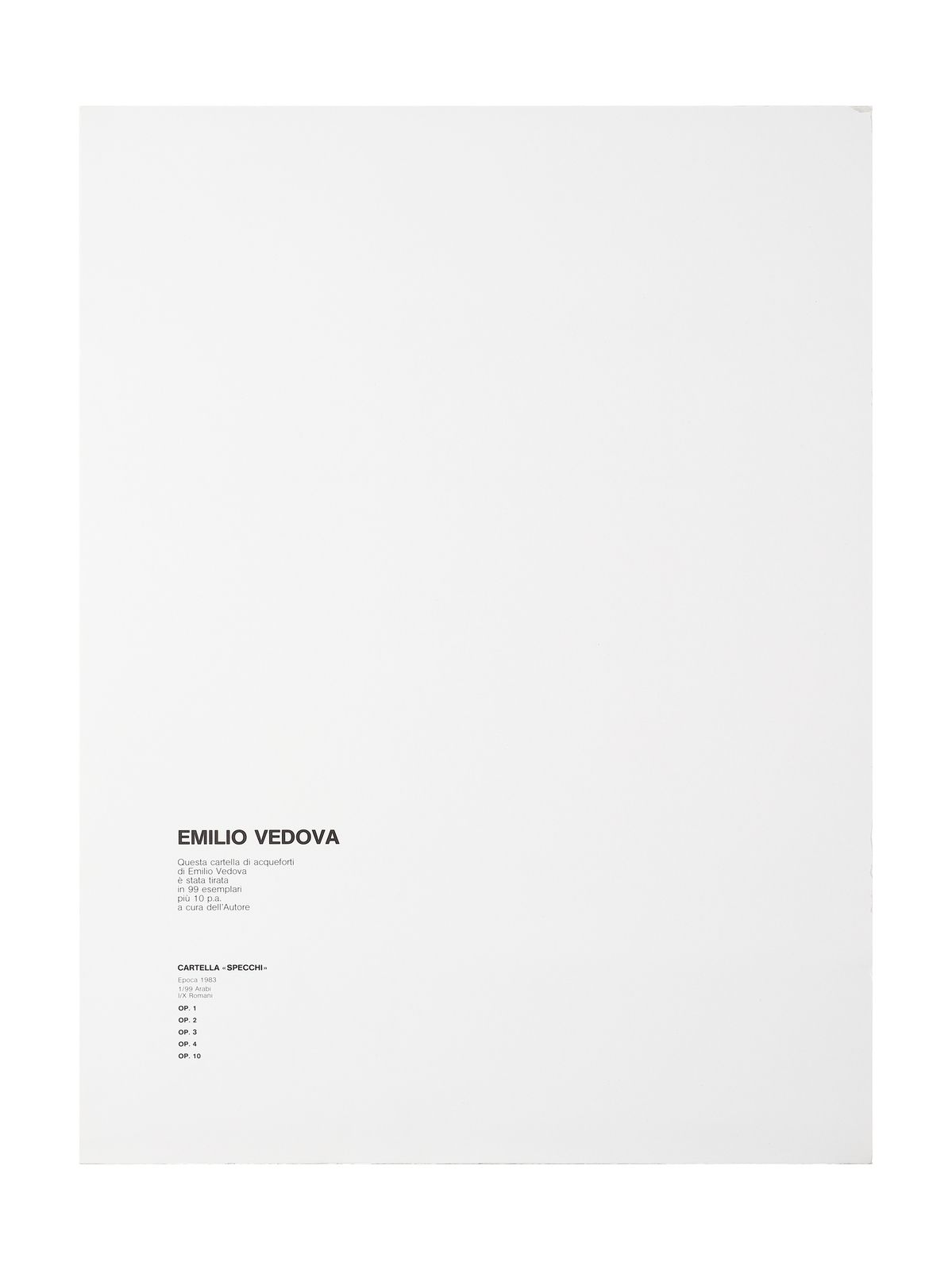 81/99. Lotto composto da n.5 acqueforti (Op.1. Op.2. Op.3. Op.4. Op.5). Dimensione lastra: 37x25.3 cm. Ogni foglio presenta firma, titolo, anno e tiratura in basso a matita. Edizione totale: 99 esemplari numerati da 1 a 99 + 10 p.a. Carta a mano Magnani di Pescia. Pubblicazione: Catalogo dell'opera grafica di Emilio Vedova 1958-1990, p.27. Presente cartella originale e colophon.