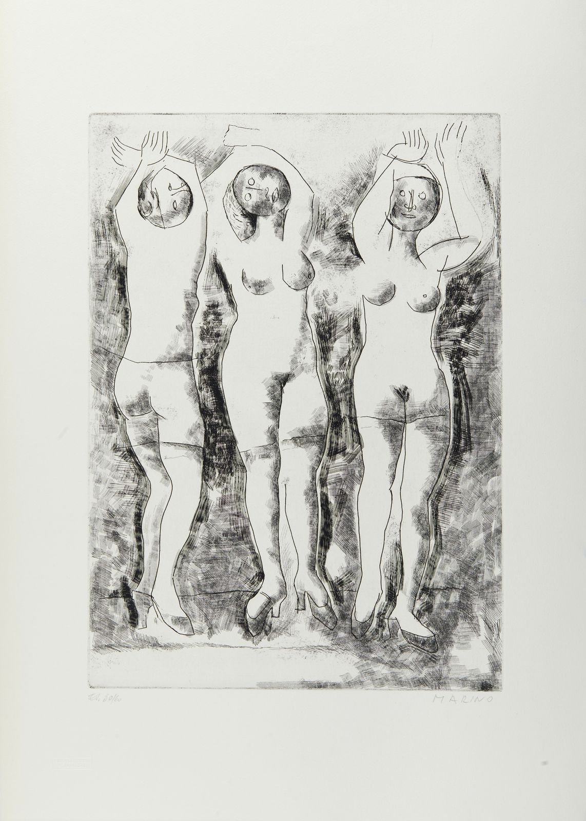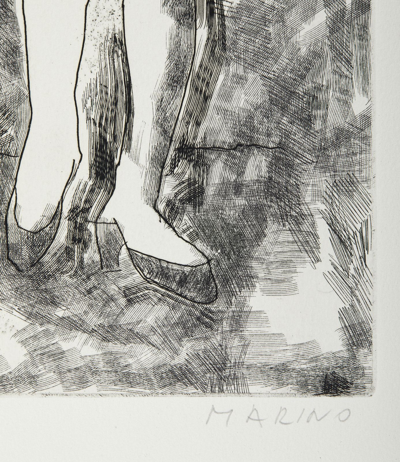 30/60. Tiratura e firma in basso a matita. Timbro a secco Luigi de Tullio stampatore in basso a sinistra. L'opera fa parte della cartella 'Marino Marini opera grafica, incisori italiani contemporanei', contenente 20 acqueforti e puntesecche incise dal 1959 al 1971, Luigi De Tullio Editore. Le incisioni sono impresse su Vélin Cuve BFK Rives Velin D'Arches e carta Tino Magnani. Edizione totale: 60 esemplari numerati da 1 a 60, 20 esemplari numerati da I a XX, 5 esemplari fuori commercio contrassegnati dalle lettere A, B, C, D, E. Dimensione lastra: 48.5x35 cm. Pubblicazioni: Catalogo ragionato dell'Opera grafica (Incisioni e Litografie) 1919-1980, a cura di Guido Guastalla, Giorgio Guastalla, Marino Marini, Edizioni Graphis Arte, Livorno, 1990, pp. 67, 209, n. A89.