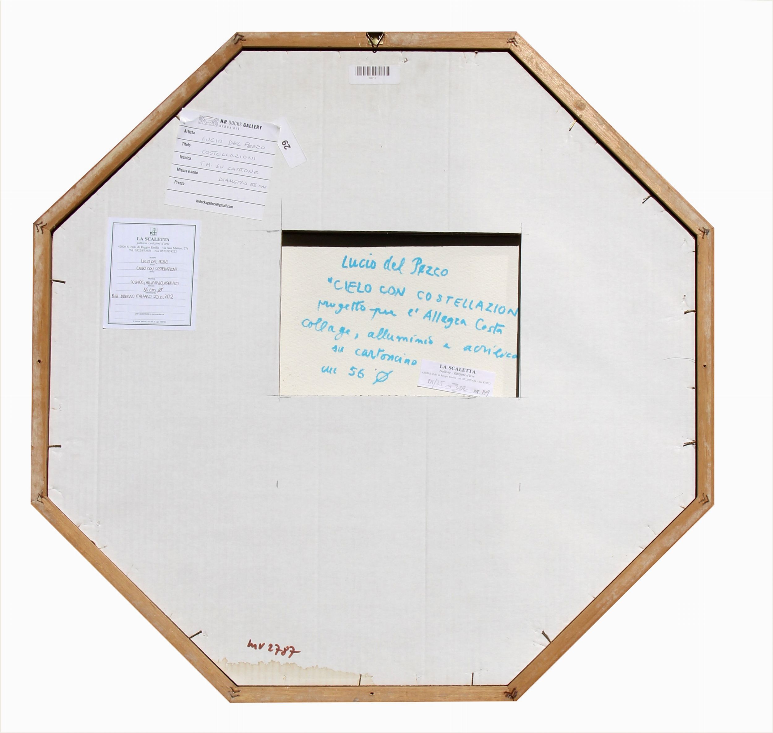 Firma, titolo, tecnica, misura Lucio Del Pezzo, Cielo con costellazioni, progetto per l'Allegra Costa, collage, alluminio e acrilico su cartoncino, cm 56 Ø;