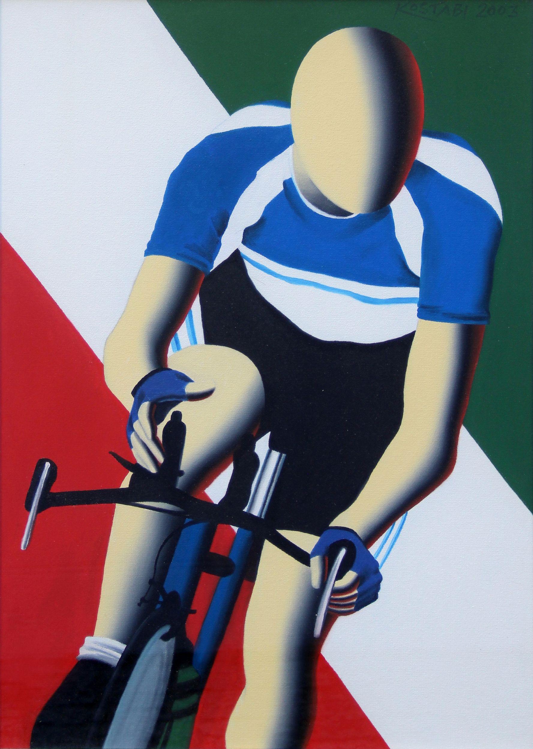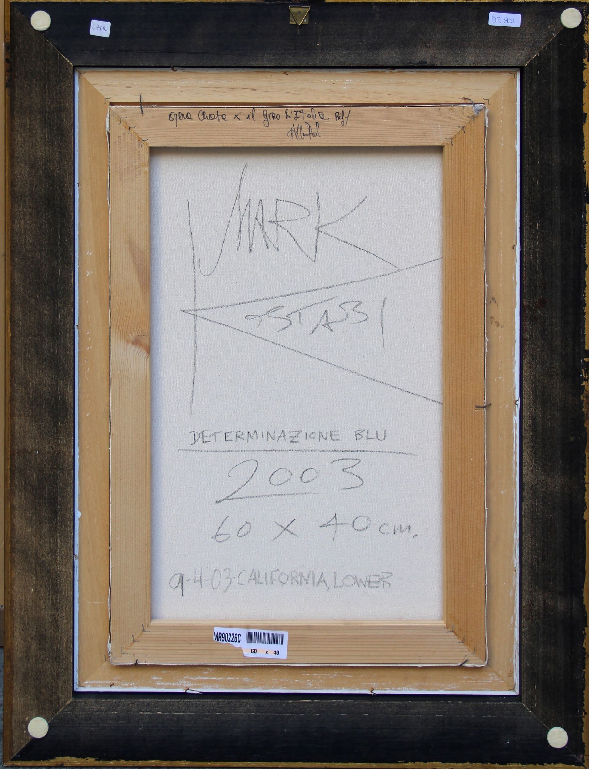 Firma, titolo, data, misura, numerazione, descrizione Mark Kostabi, Determinazione blu, 2003, 60x40 cm., 9-4-03-California lower, Opera creata x il Giro d'Italia;