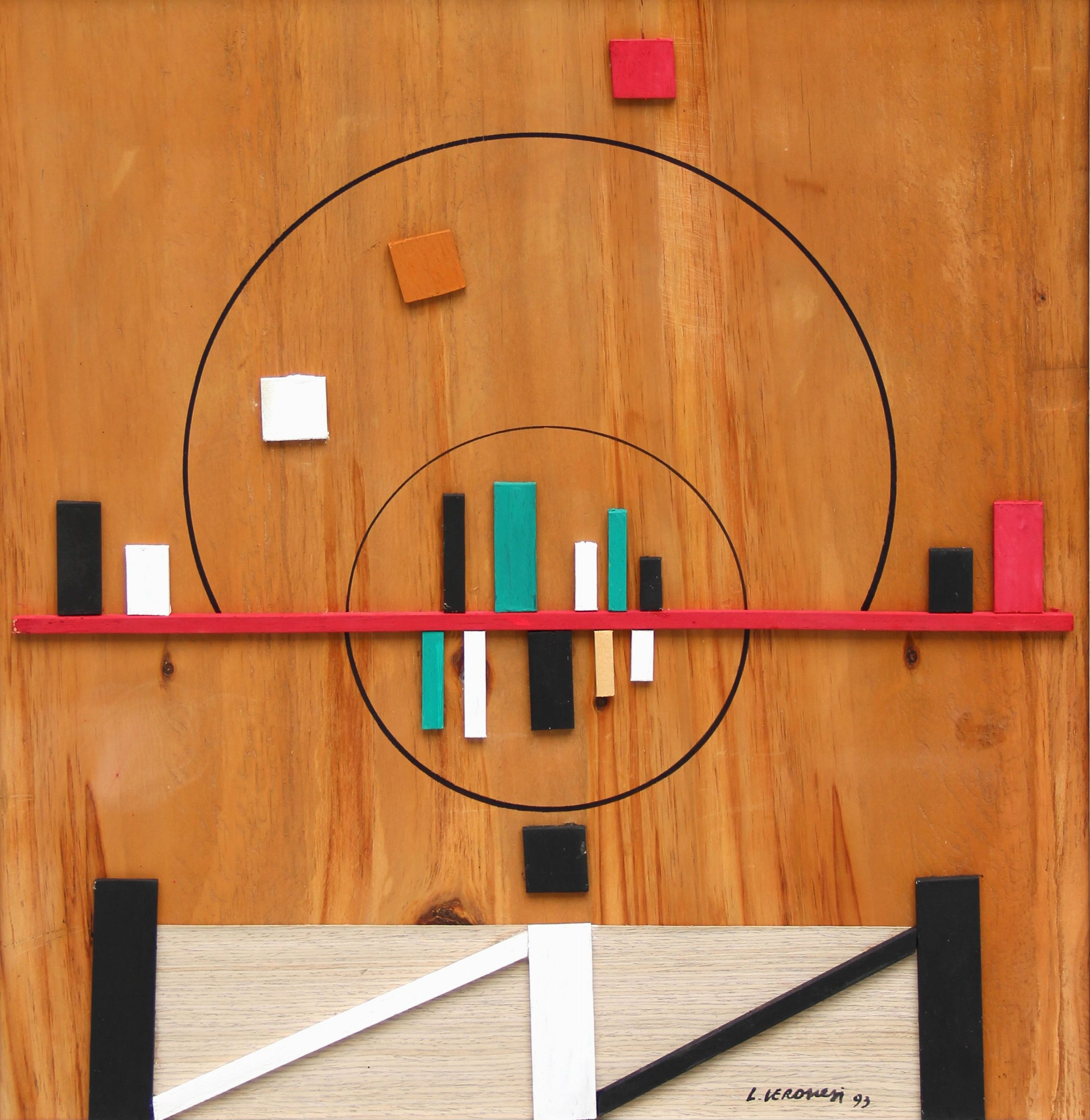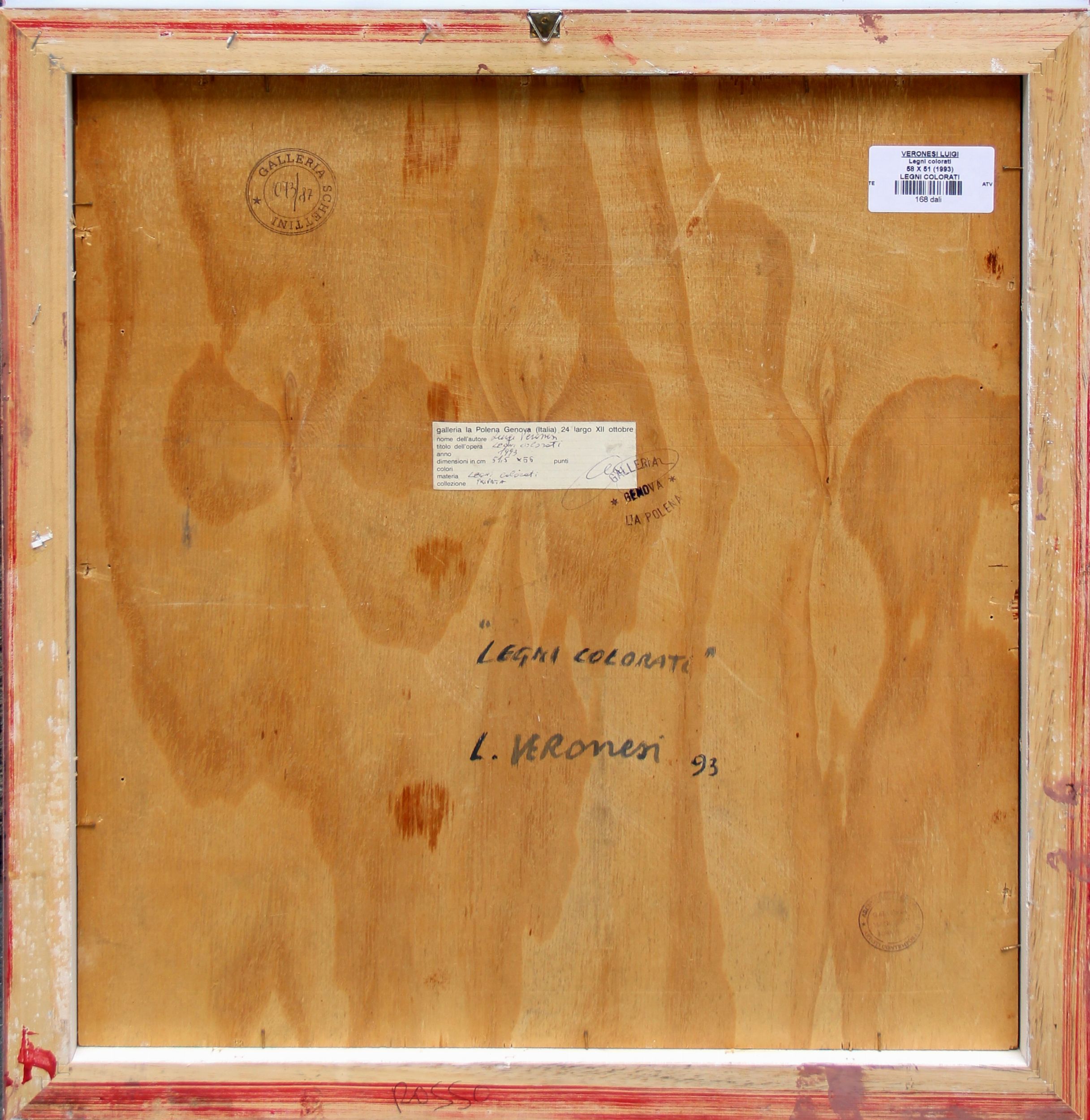 Titolo, firma, data Legni colorati, L. Veronesi, 93; timbro di Galleria Schettini, Milano; etichetta e timbro di Galleria La Polena, Genova; timbro di Galleria d'Arte Maggiore, Roma (al retro)