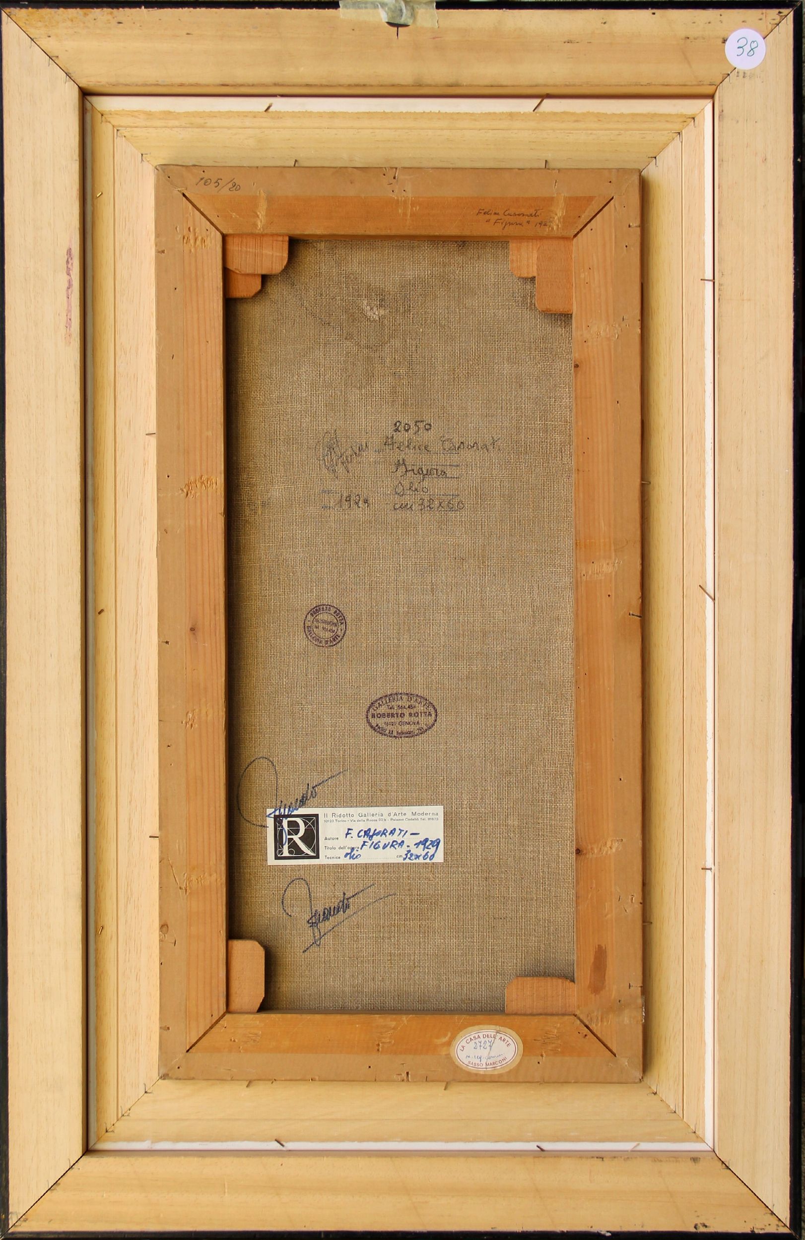 Firma F. Casorati (in basso a destra)Timbro di Galleria d'Arte Roberto Rotta, Genova;etichetta di Il Ridotto Galleria d'Arte, Torino;etichetta di La casa dell'arte, Sasso Marconi (al retro)
