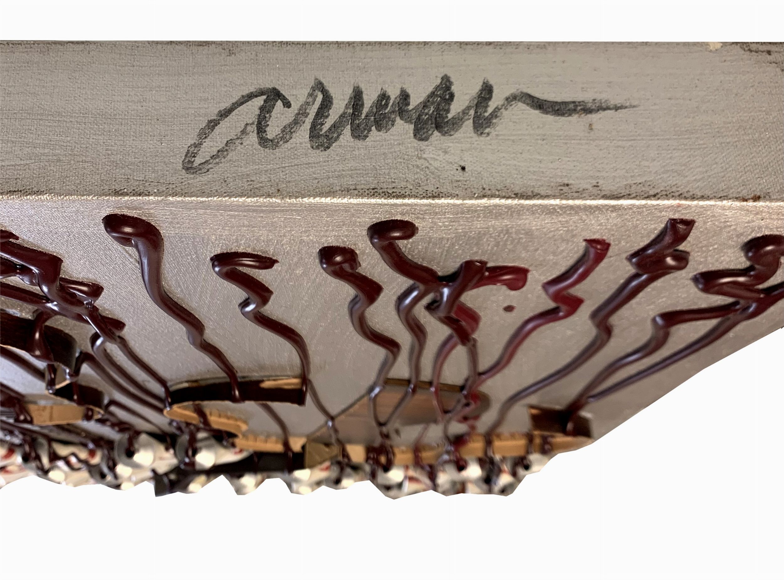chitarra spezzata e tubetti di colore su tela applicata su tavola, cm 82x61