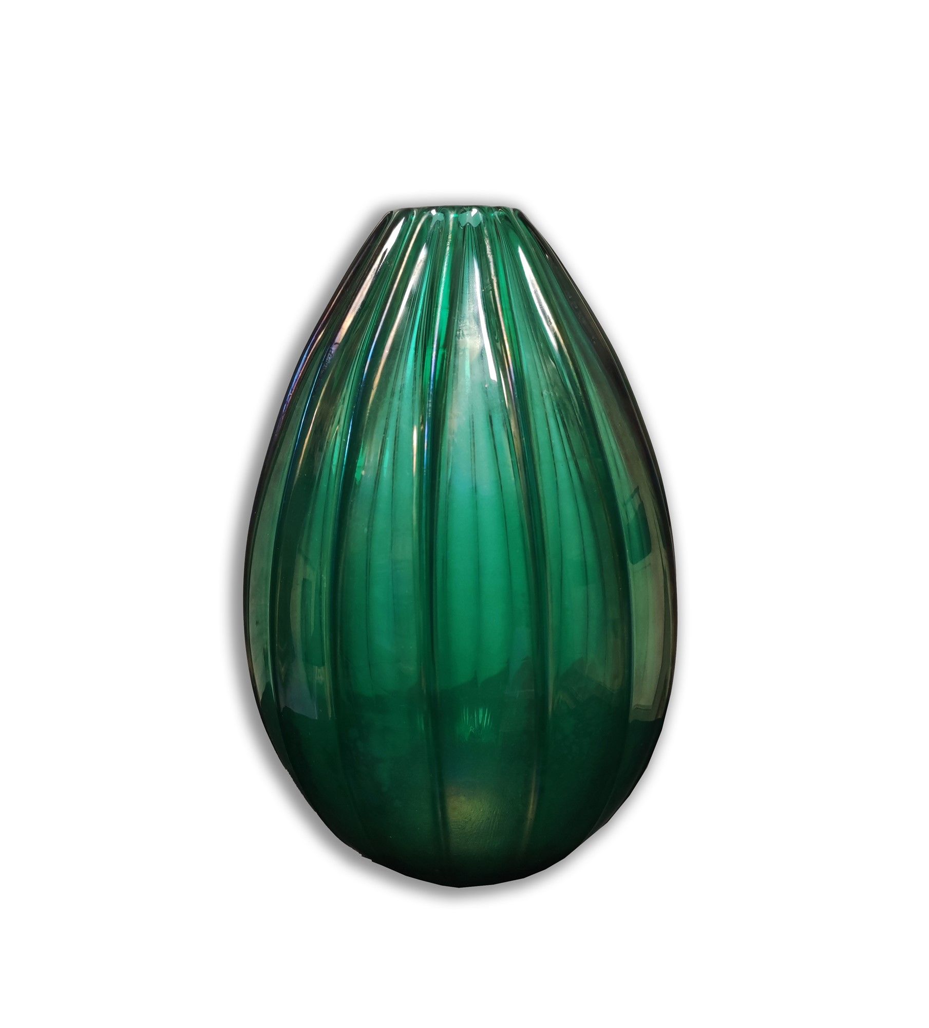 Vaso in vetro di Murano nervato di colore verde iridescente